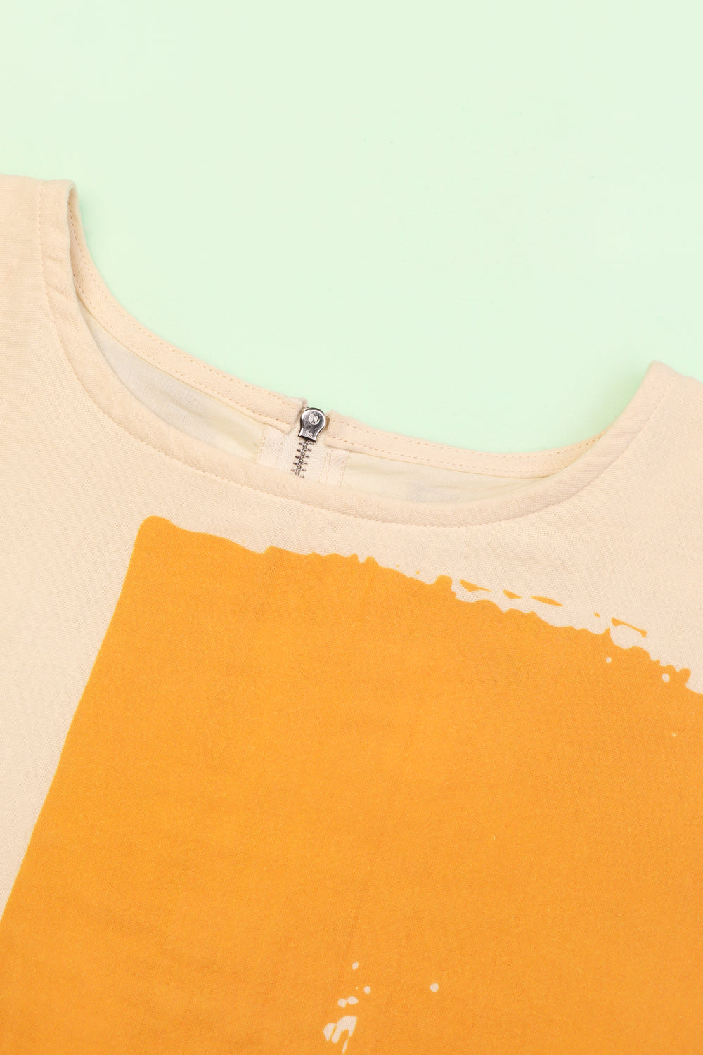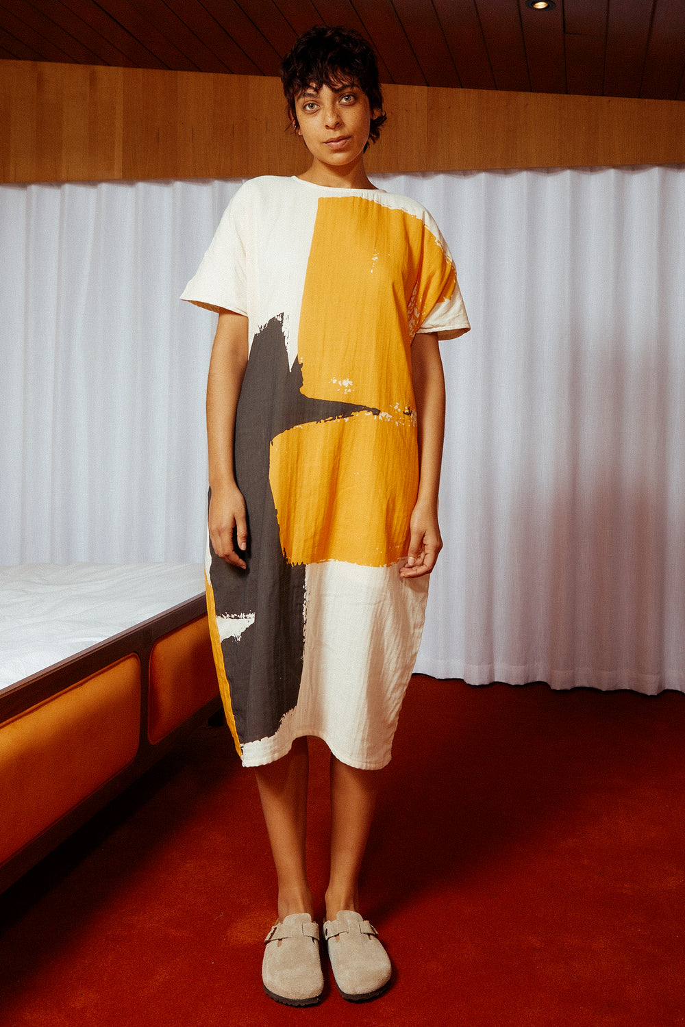 The Alcott Dress is an easy-wearing, relaxed fit smock dress with flattering cap sleeves. Features a round neckline and a silver back zip, and side seam pockets. Crafted from a double layered cotton gauze, with the bold brushstrokes of our seasonal Geo print.