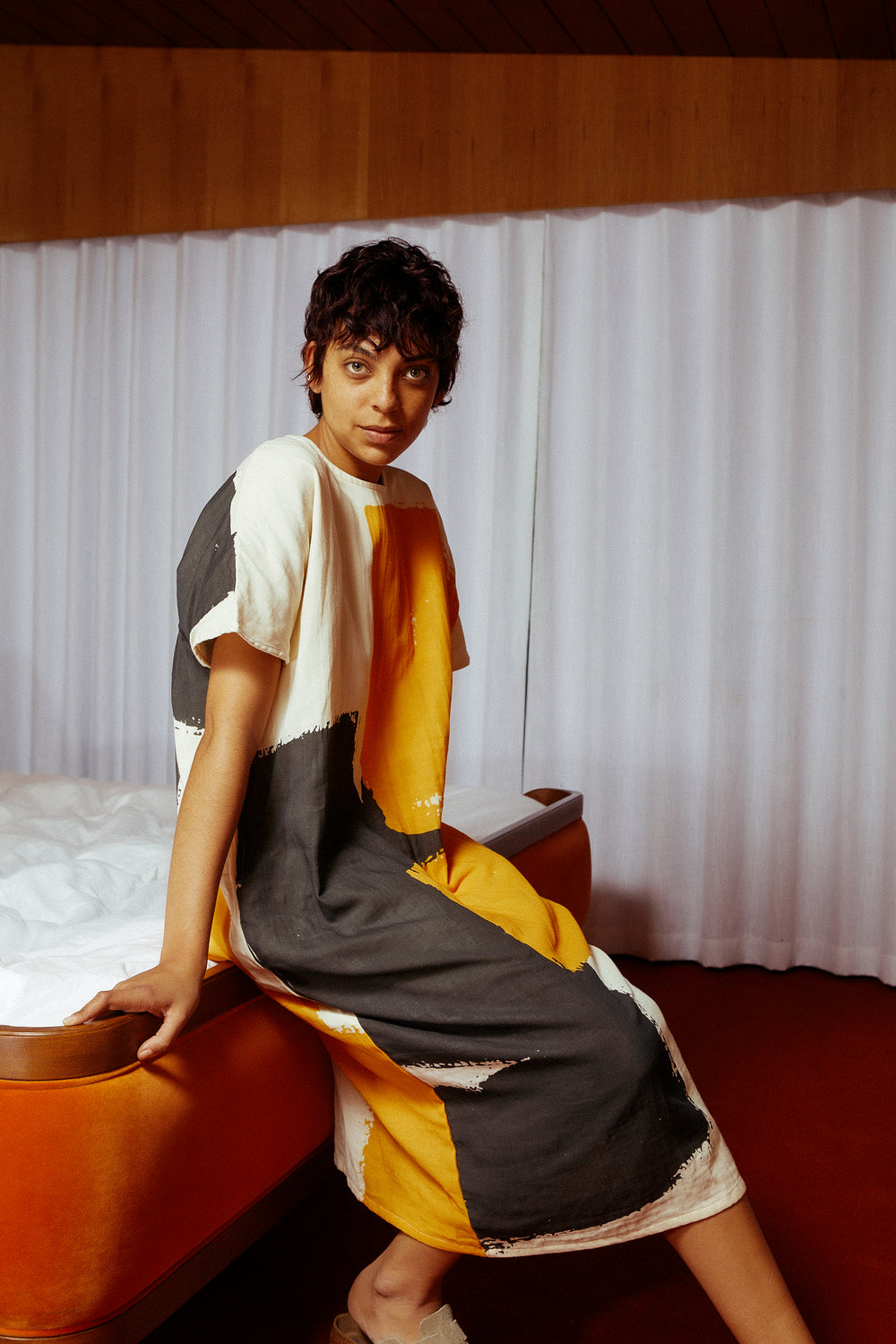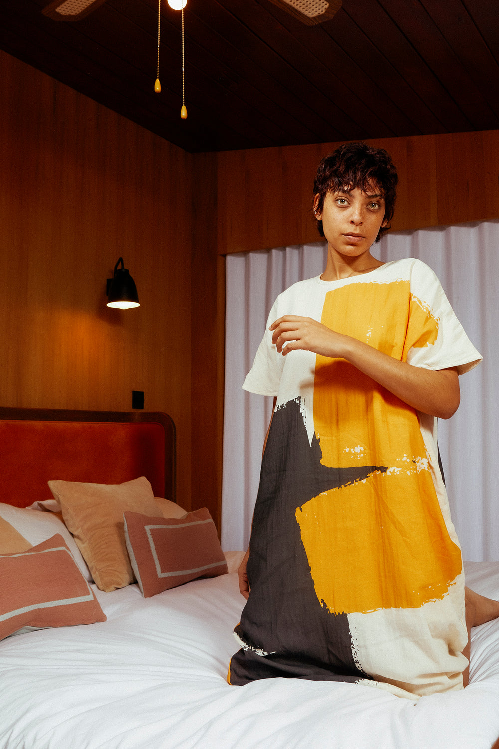 Midi length. Relaxed fit. Square cut. Cotton gauze. Geo Print.