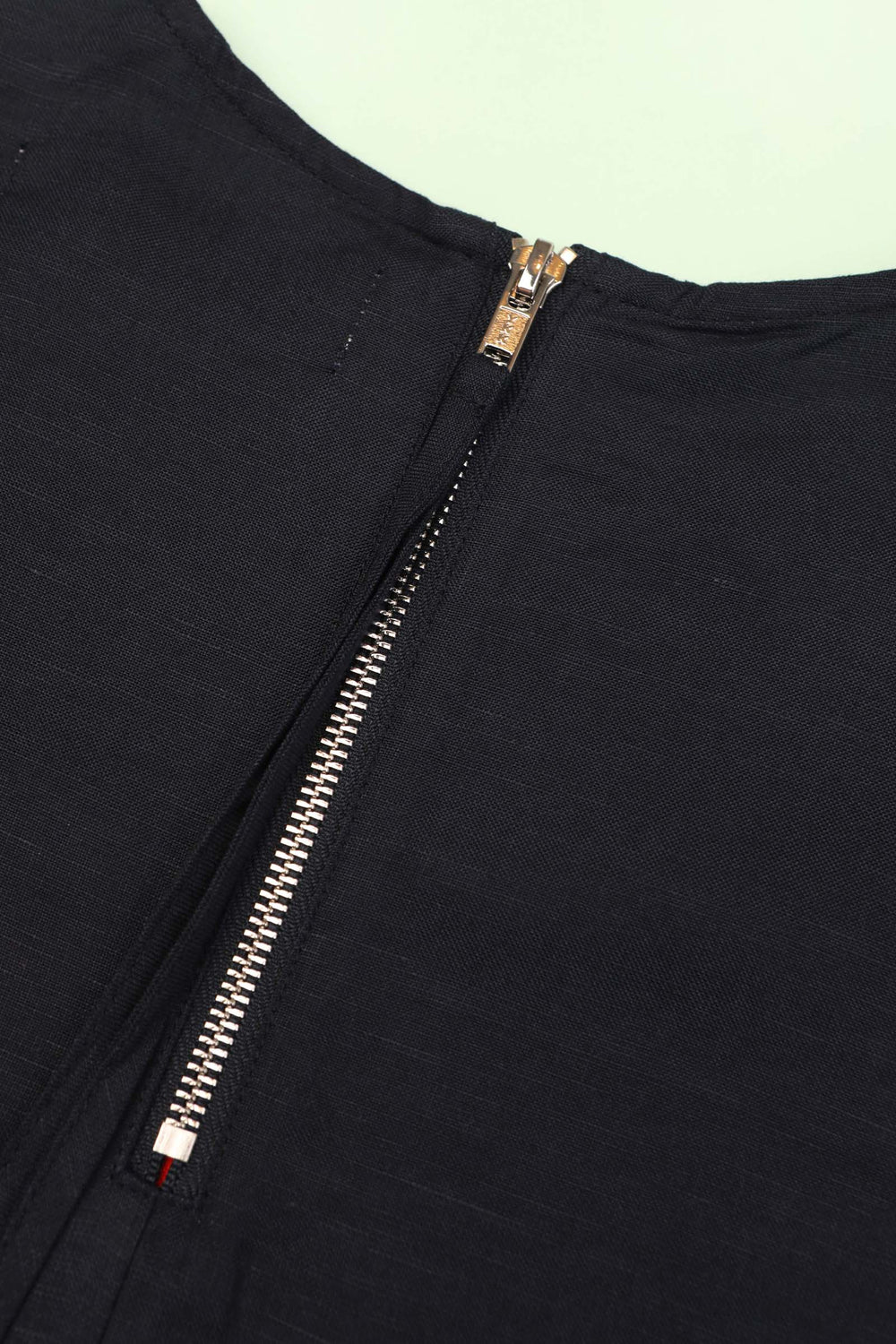 The Aldon Dress is a cocoon shaped, midi length dress, with 3/4 length dolman sleeves and a round neckline fastened with a back zipper. Crafted from a linen rayon blend of bold patchwork colours on a midnight blue base.