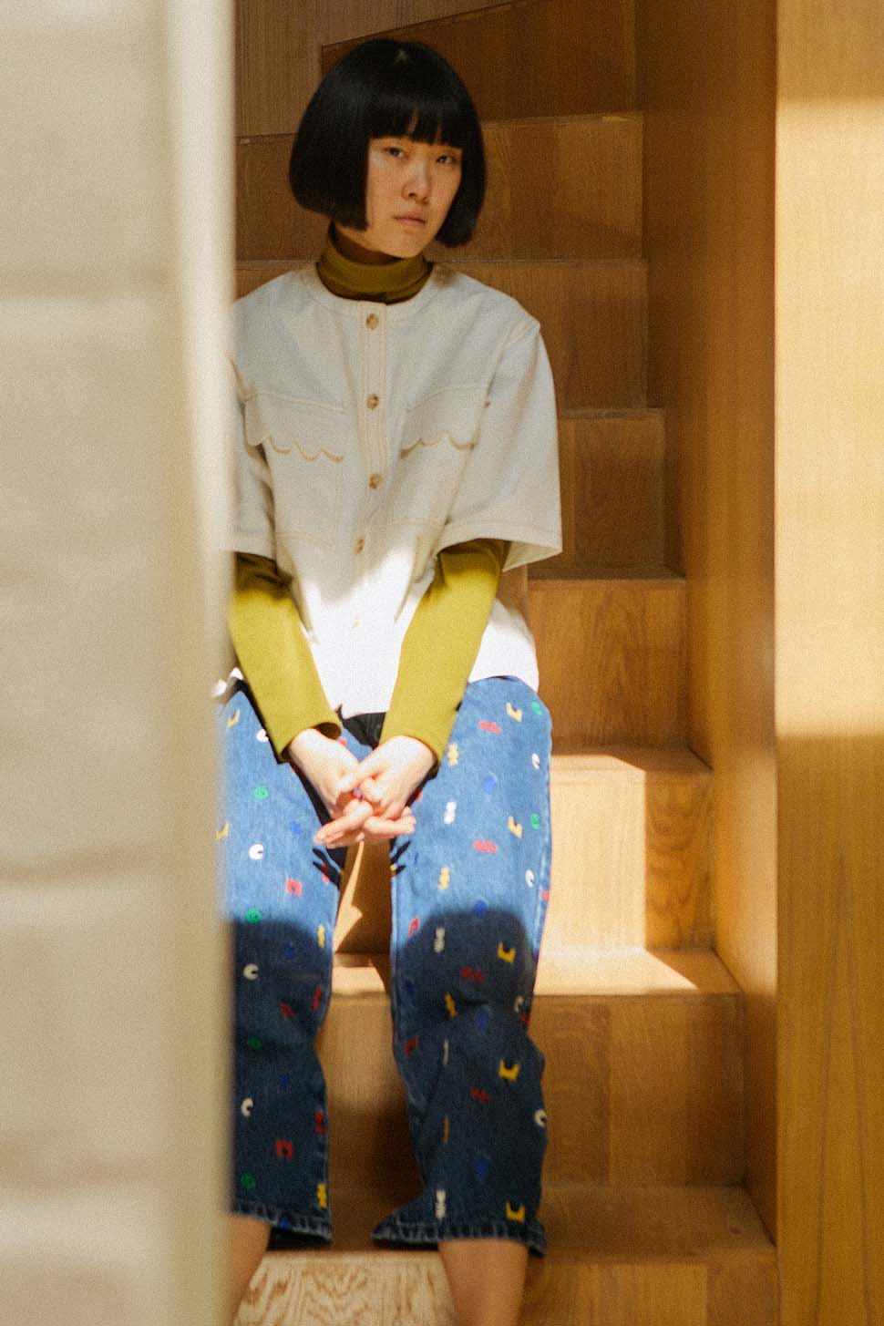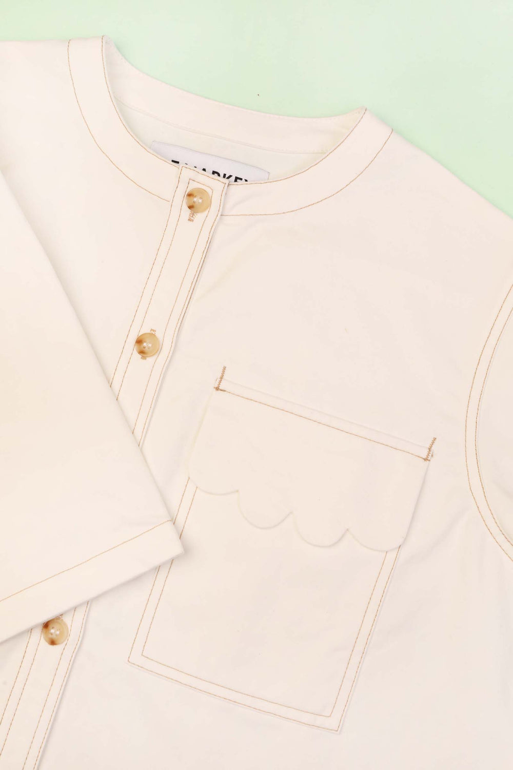 The Alwyn Top is a boxy, square cut top with a round neckline and imitation horn buttons down the front. Made in a structured cotton twill, with two front chest pockets and contrast ochre stitching throughout.
