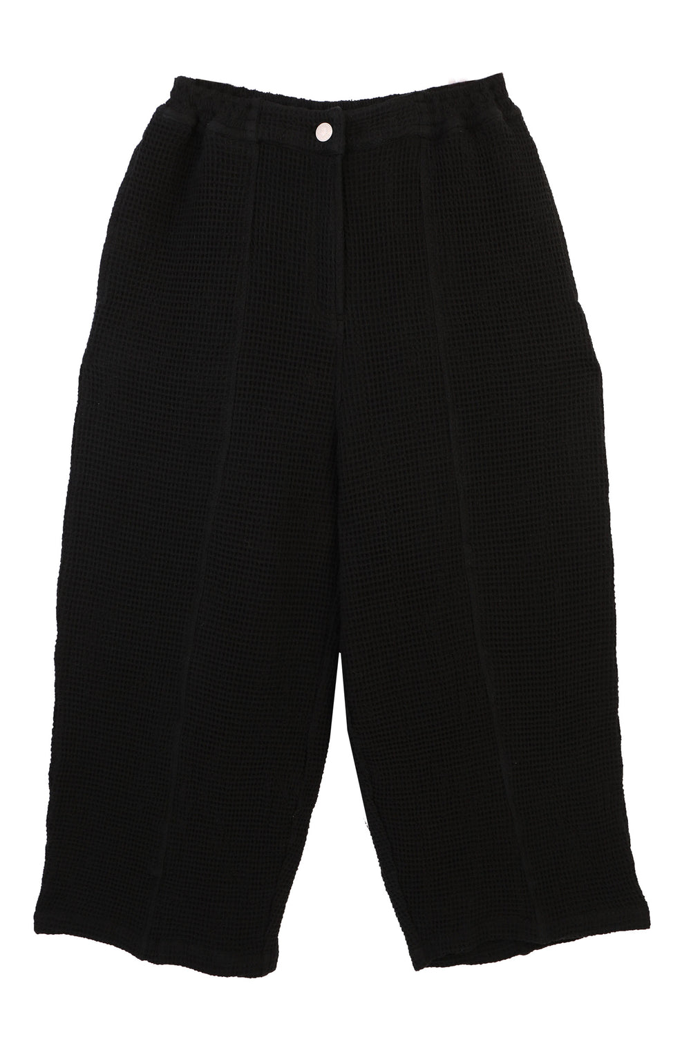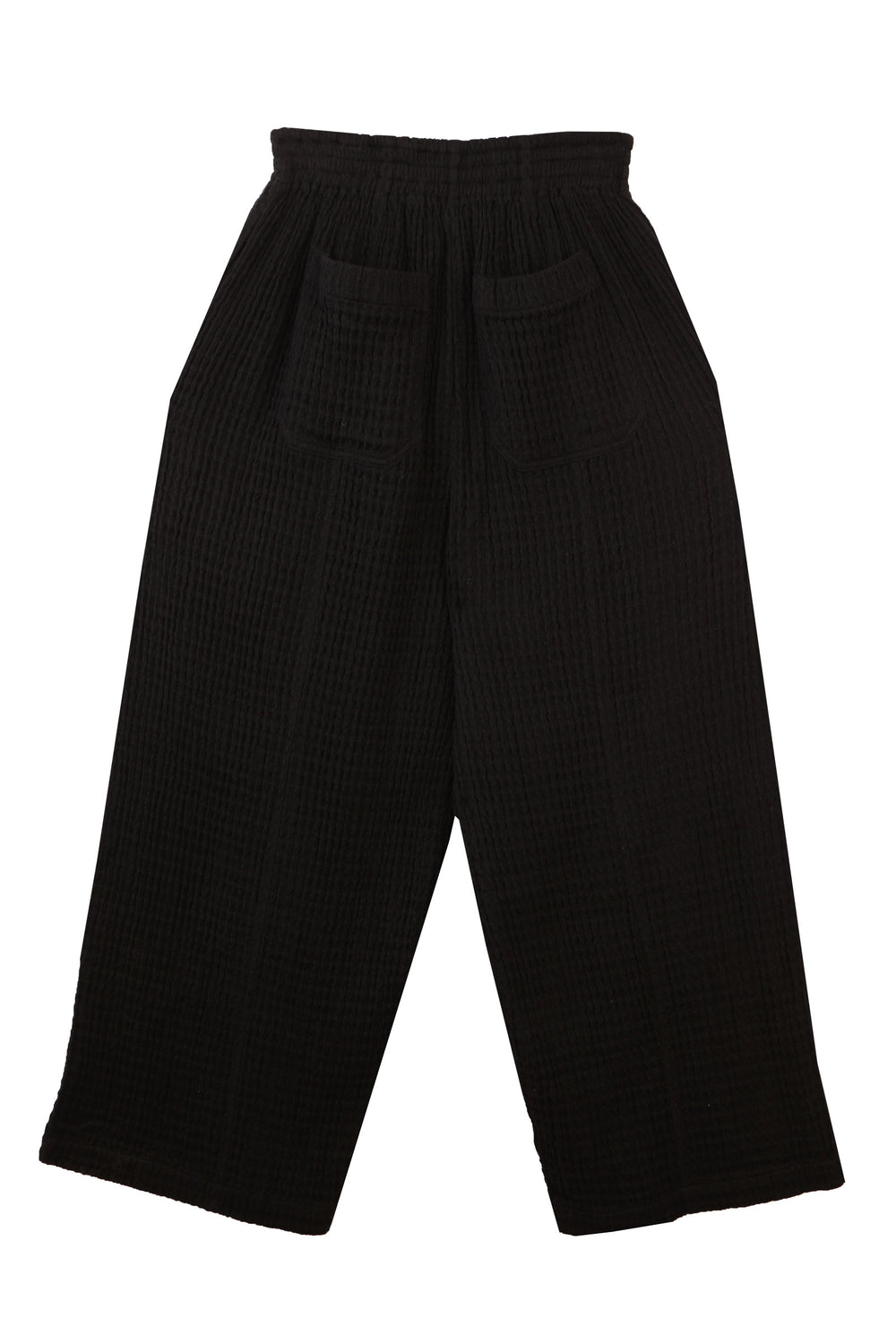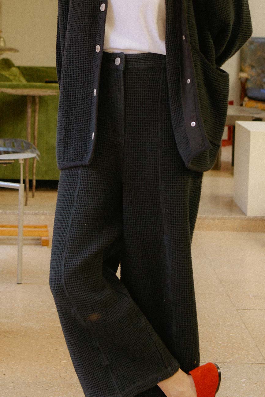 Organic cotton. Black trouser. Relaxed fit. Waffle dobby.