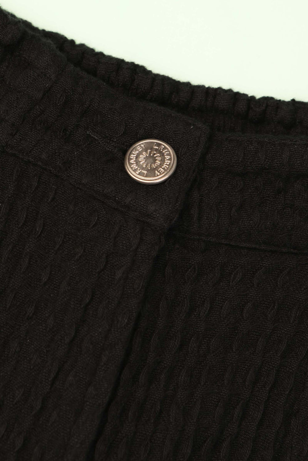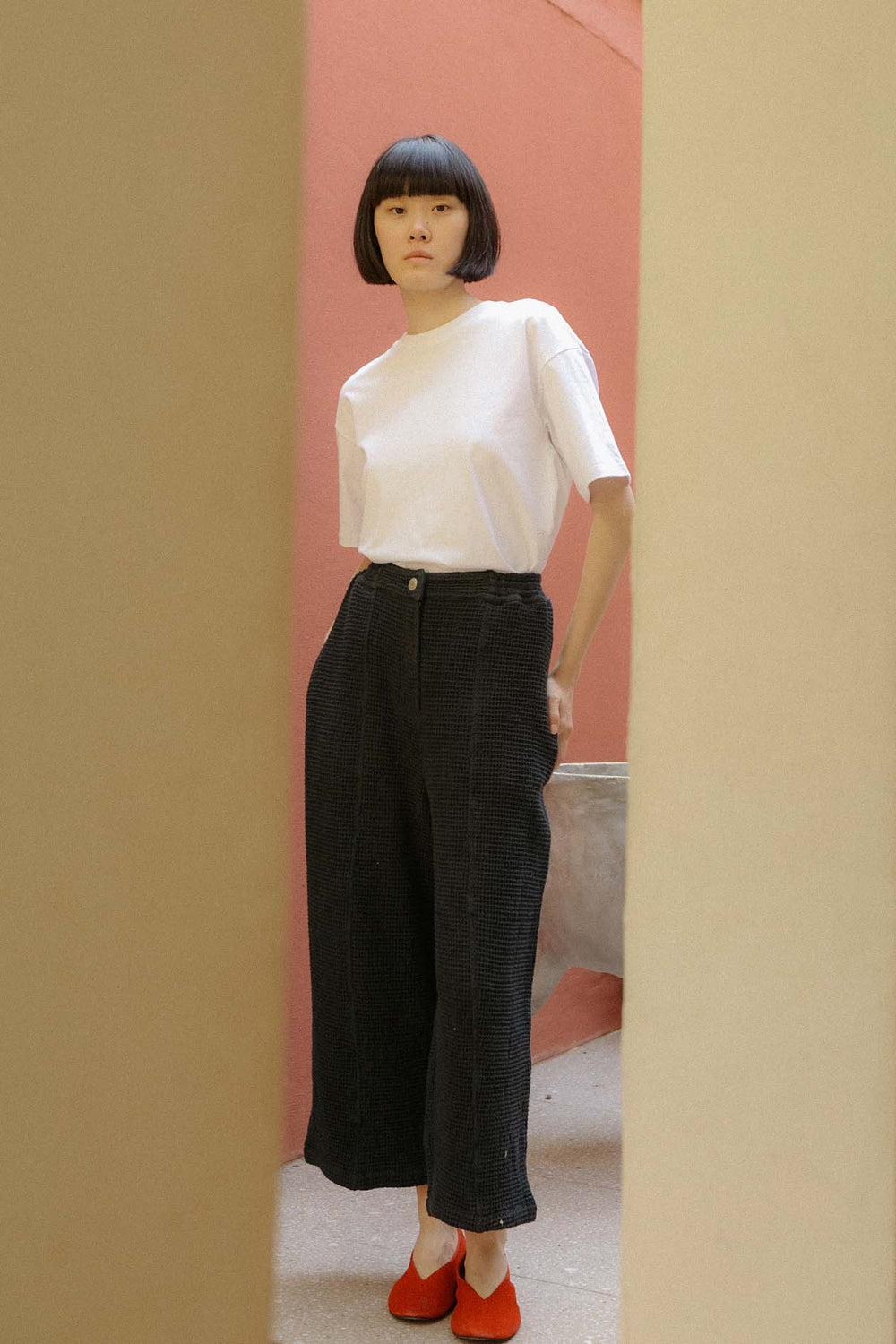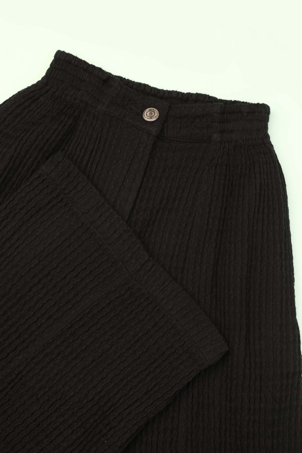 Organic cotton. Black trouser. Relaxed fit. Waffle dobby.