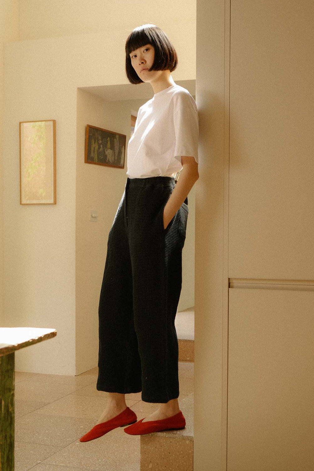 The Austin Trouser has a spacious relaxed fit, elasticated high waist and a slight barrel-leg shape. Made in a deeply textural organic cotton waffle dobby fabric.