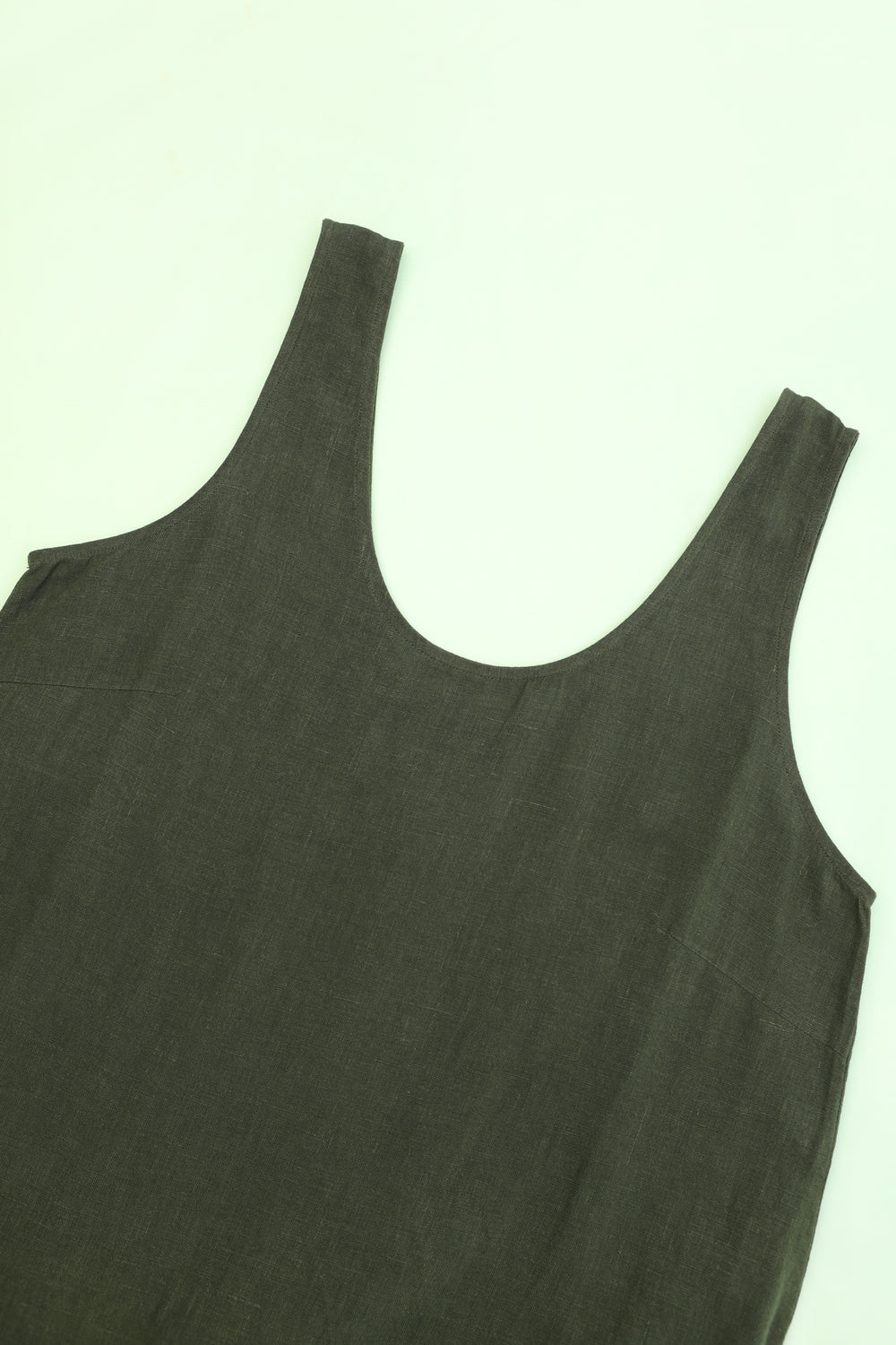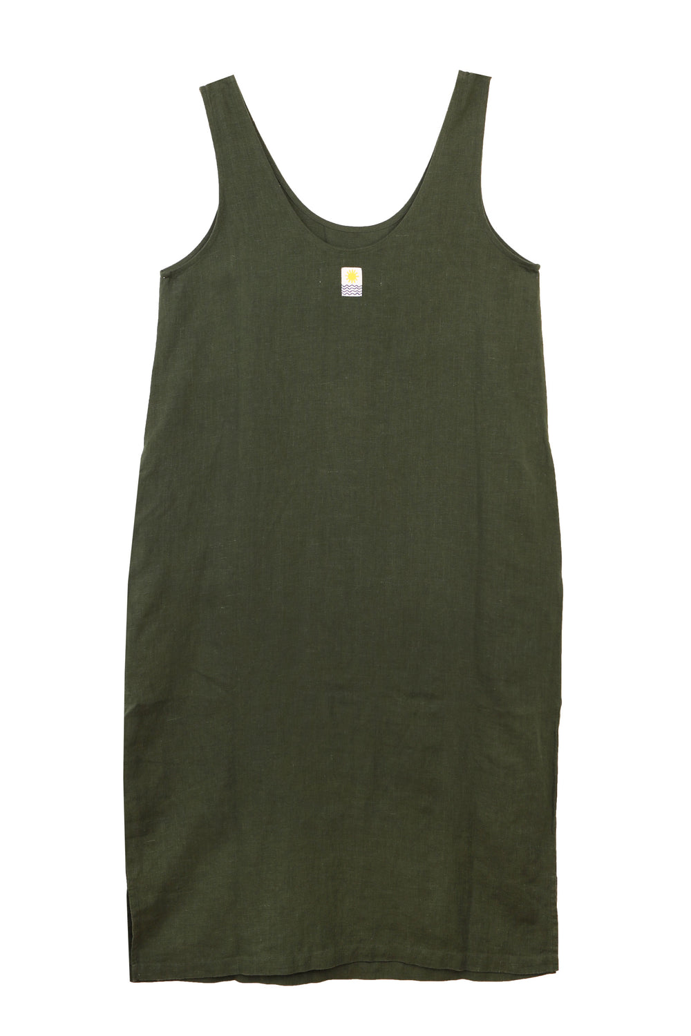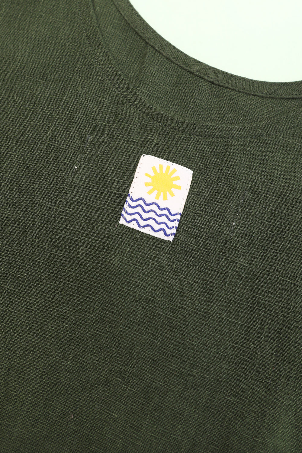 This mid-length basic linen shift dress is the perfect summer smock. Lightweight, breathable with side pockets and our signature sun and wave woven patch on the back.
