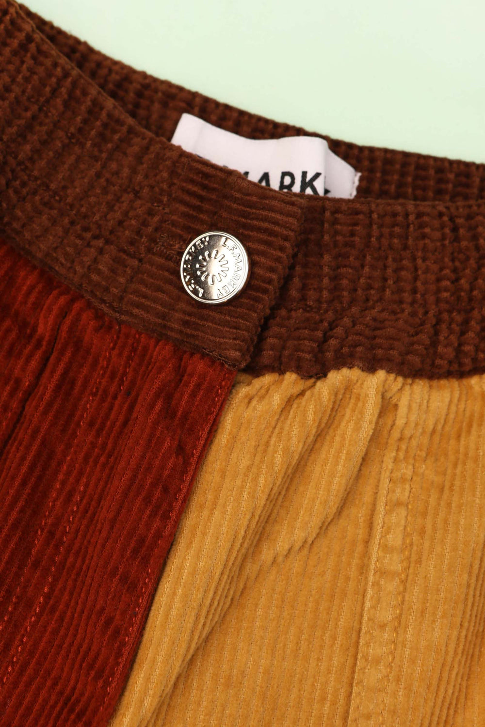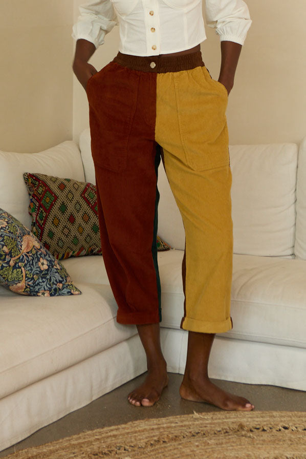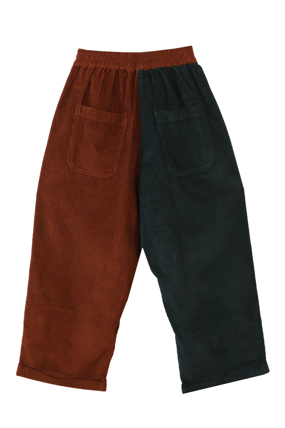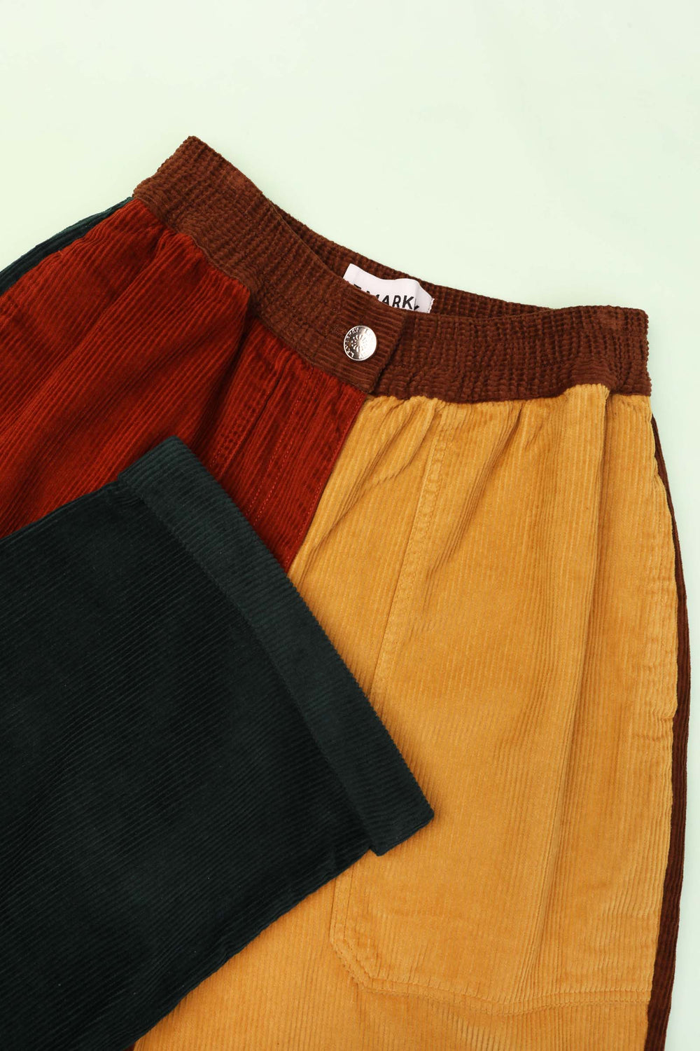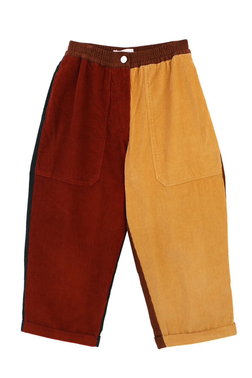 Relaxed fit, straight leg, cropped trouser crafted from a wide wale cotton corduroy in a patchwork medley of complementary colours. With large utility-style pockets in the front and back. Wide cuffs at the hem and a high elasticated waist.