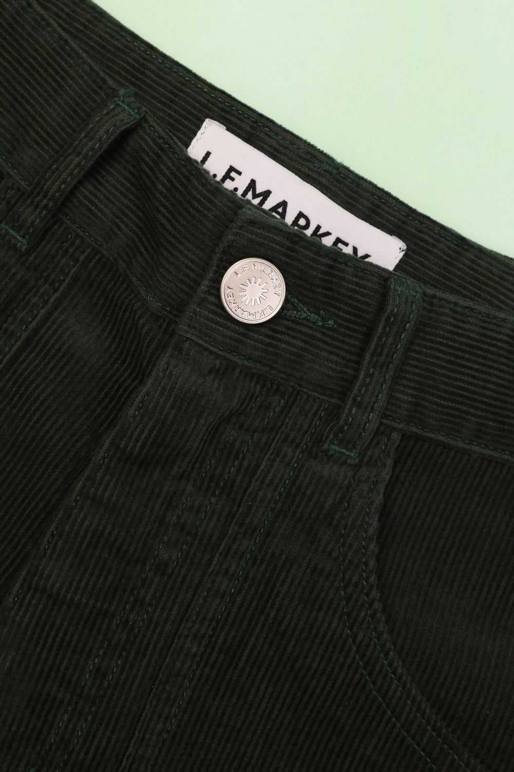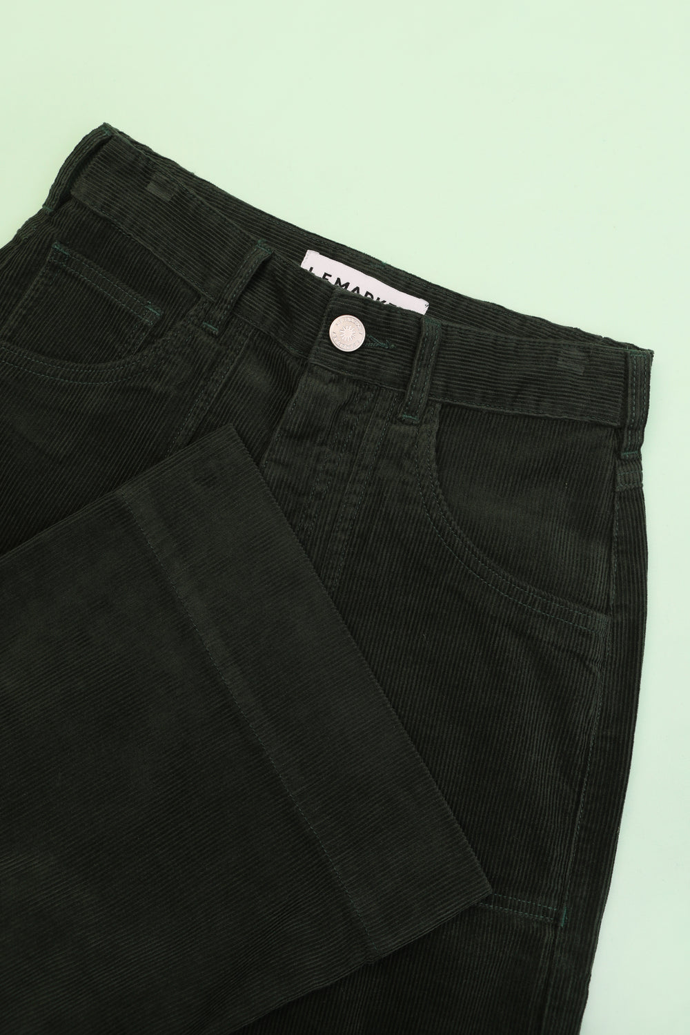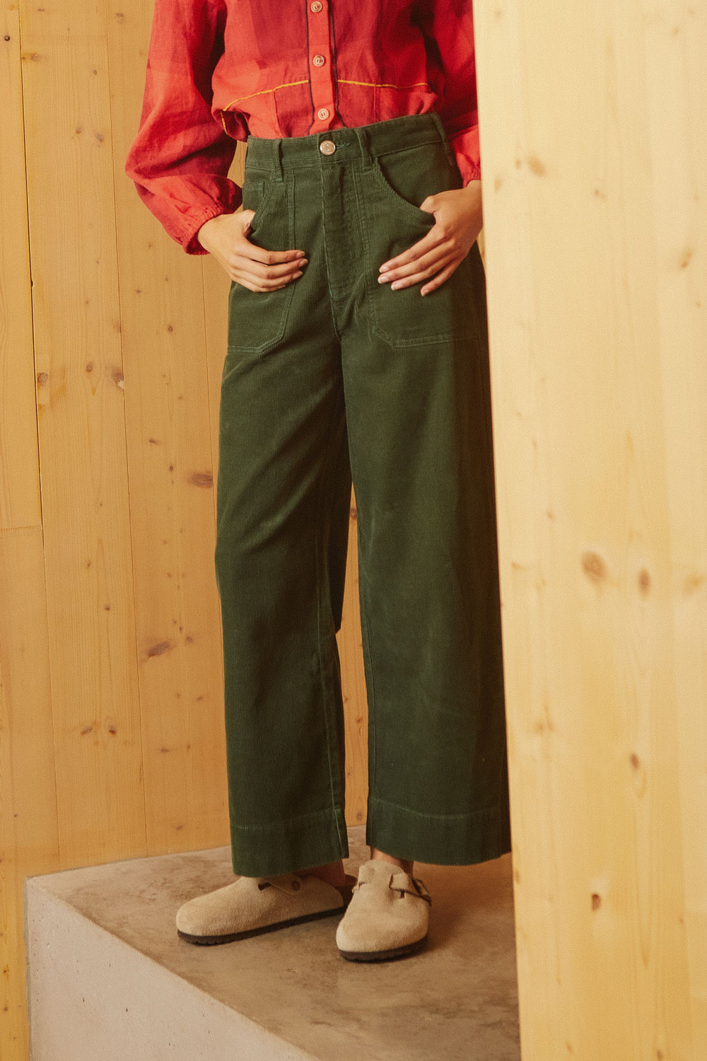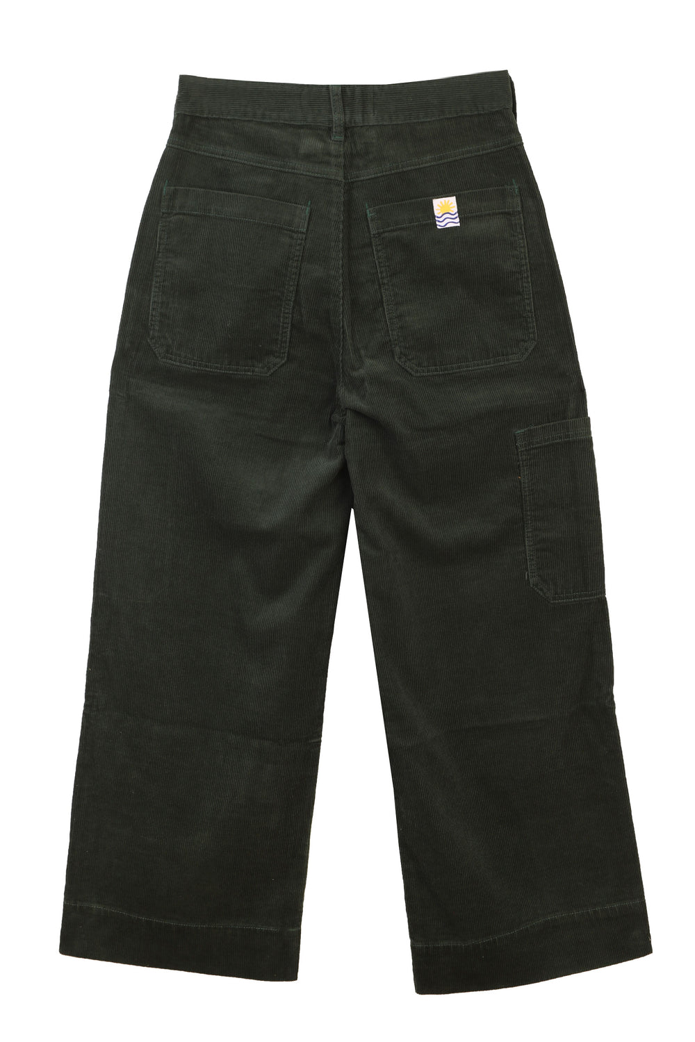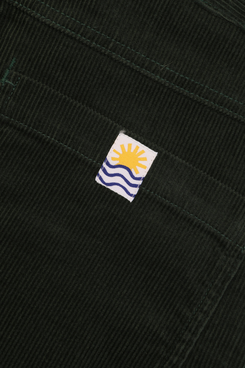 The Carpenter Trouser is a classic workwear staple, fitted at the waist with a straight cut leg. Made from a forest green cotton corduroy. Features angular utility pocket detailing and our small sun and wave woven patch logo on the back.