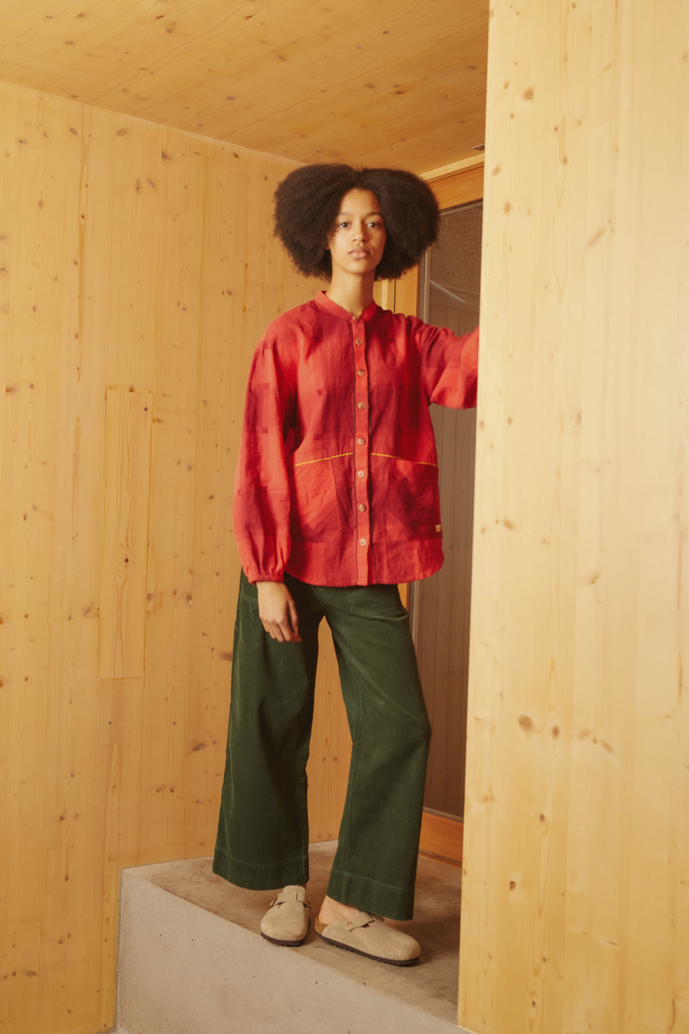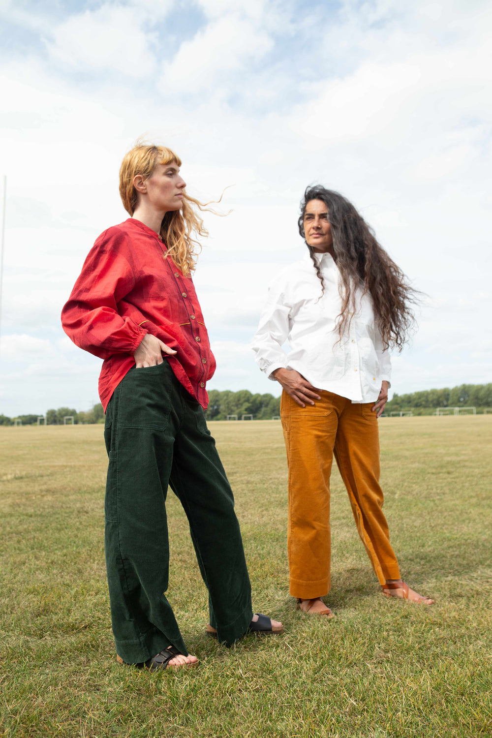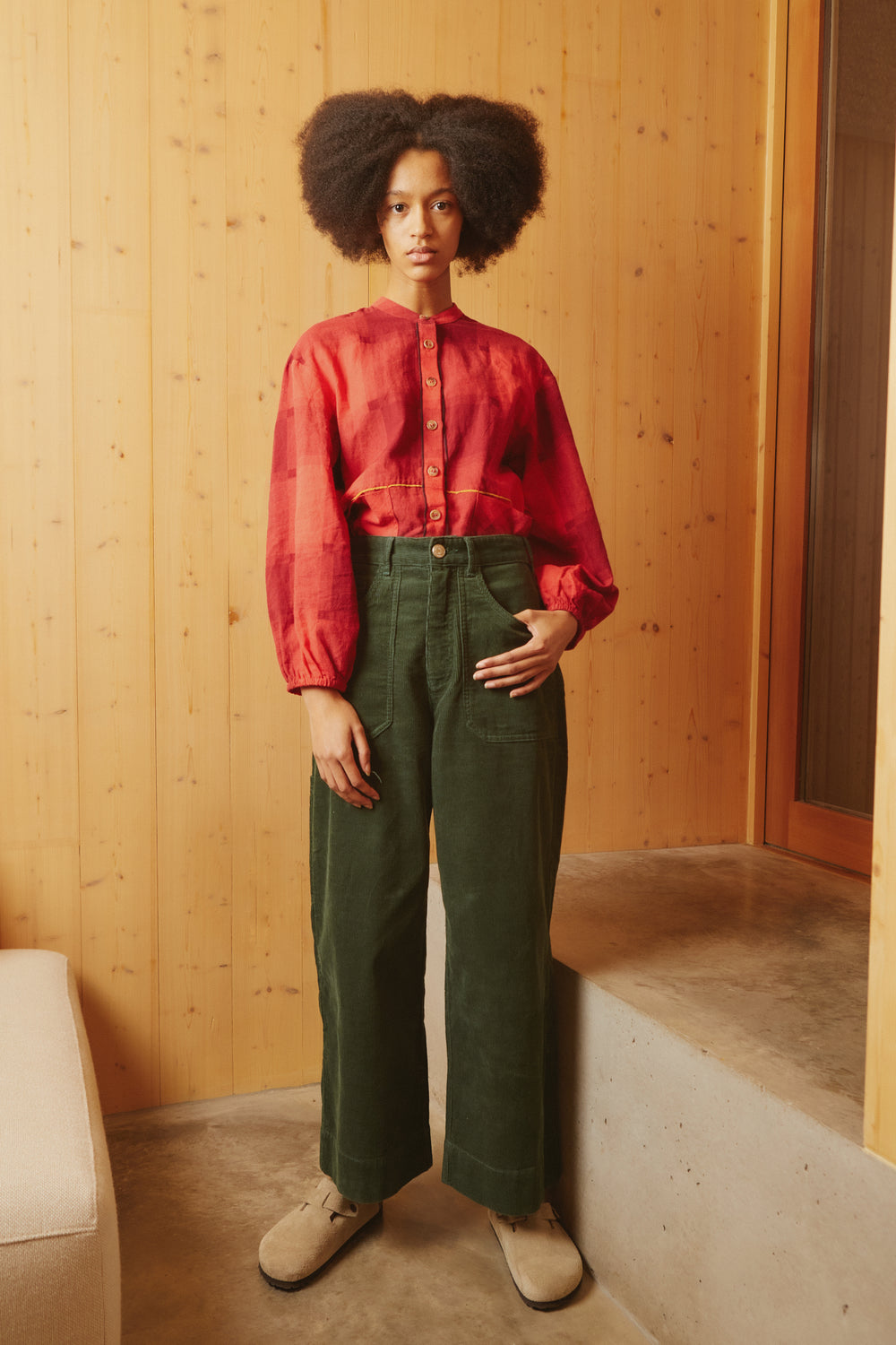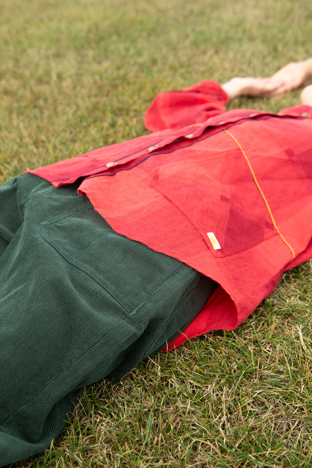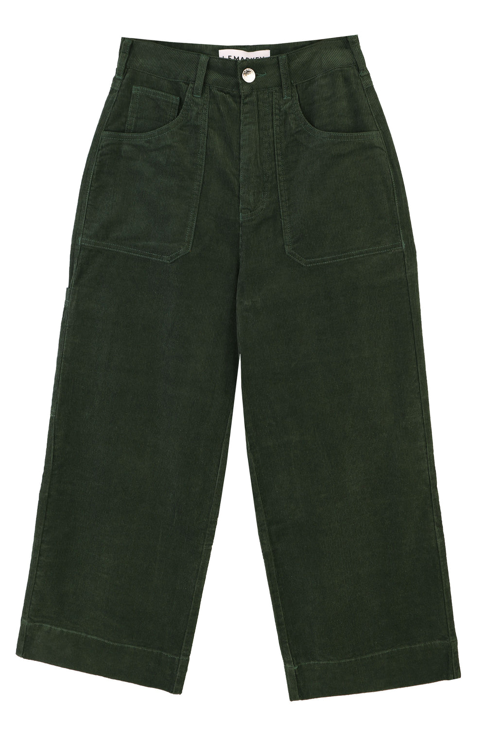 The Carpenter Trouser is a classic workwear staple, fitted at the waist with a straight cut leg. Made from a forest green cotton corduroy. Features angular utility pocket detailing and our small sun and wave woven patch logo on the back.