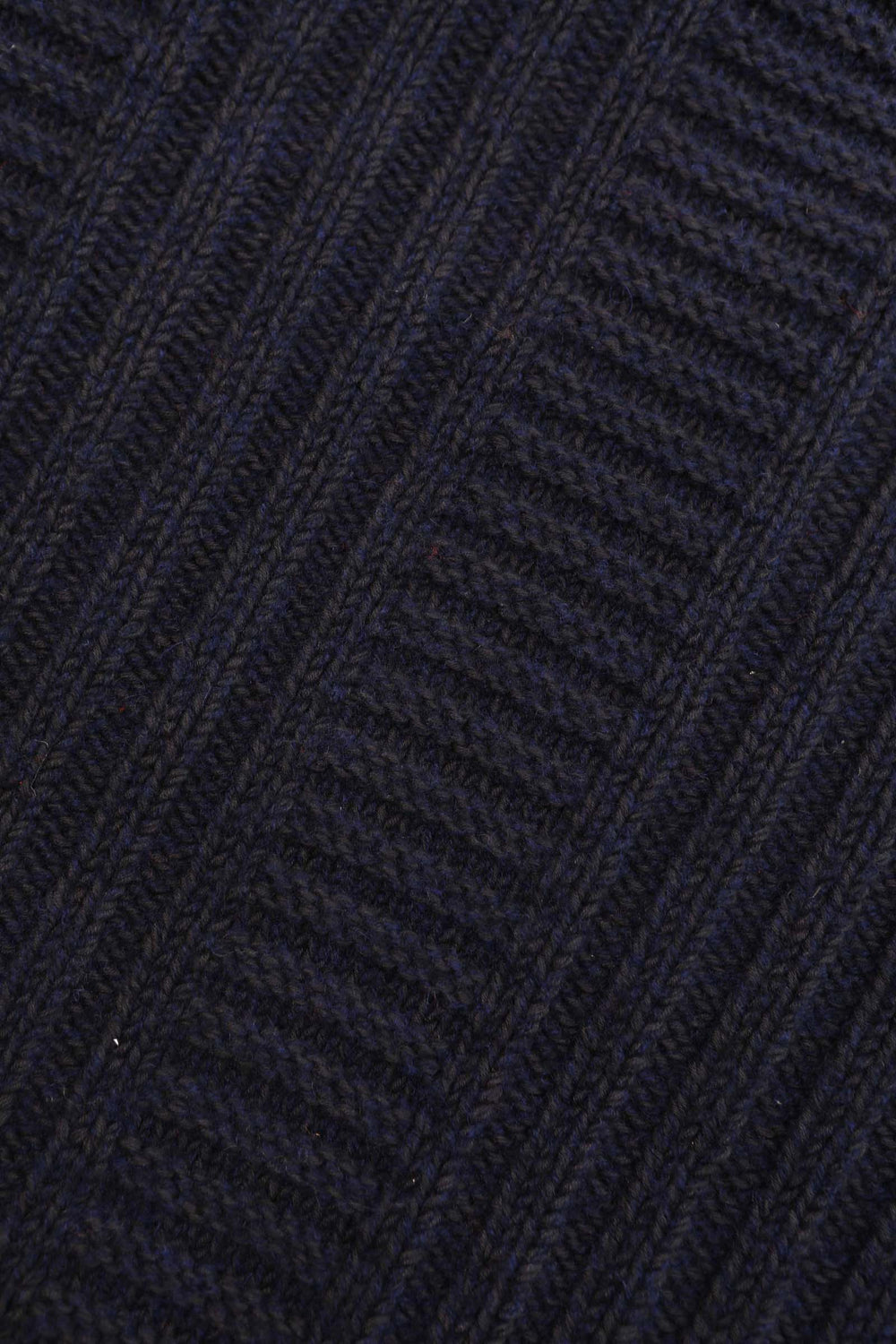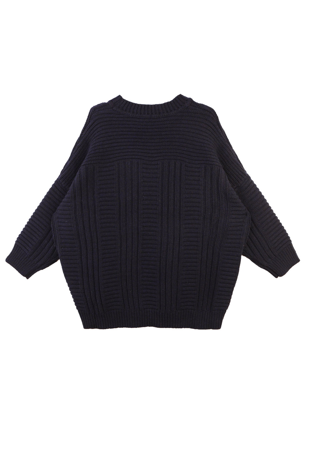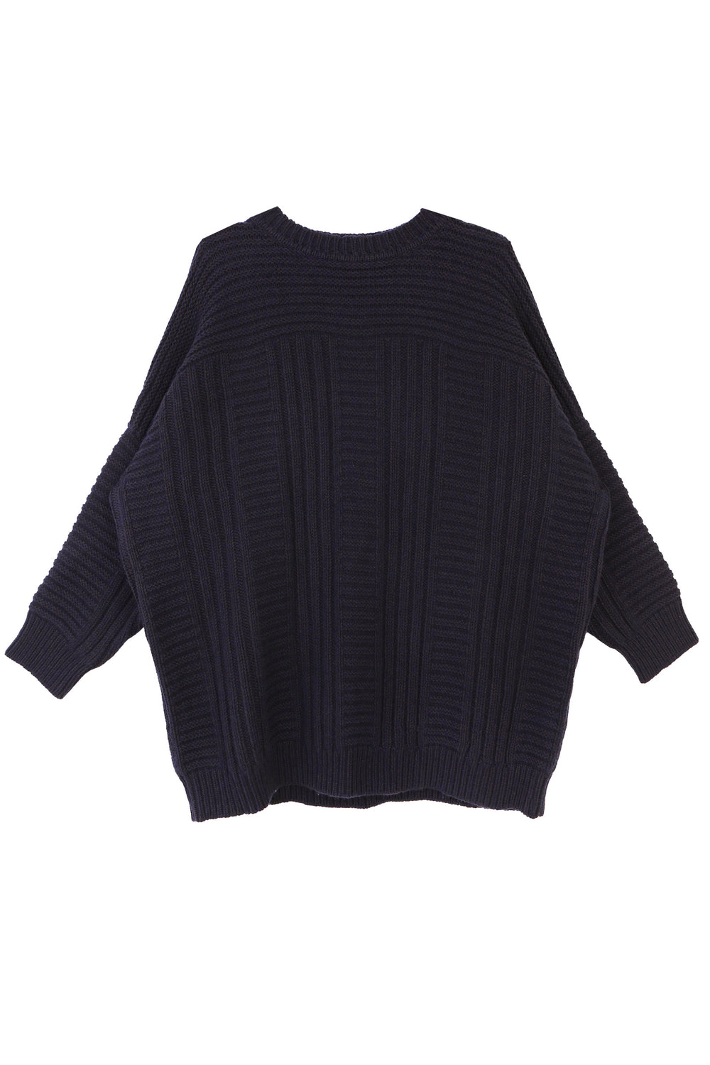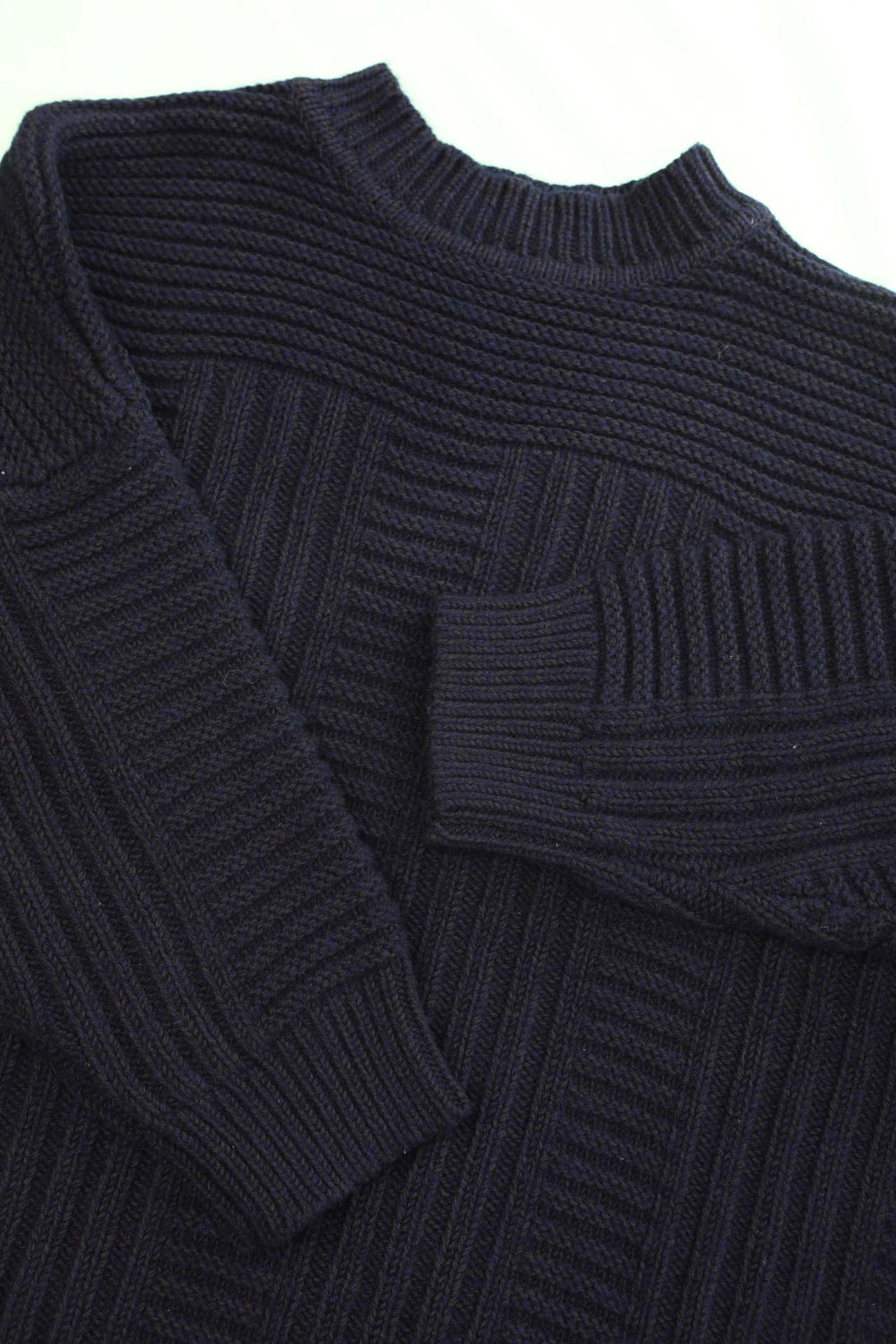 The Cassian Knit is a chunky oversized jumper, knitted with a midnight navy hued wool blend yarn in an interlocking geometric cable knit pattern. Shaped with a crew neck, dropped shoulder, falling to low-hip length with a ribbed hem and cuffs.