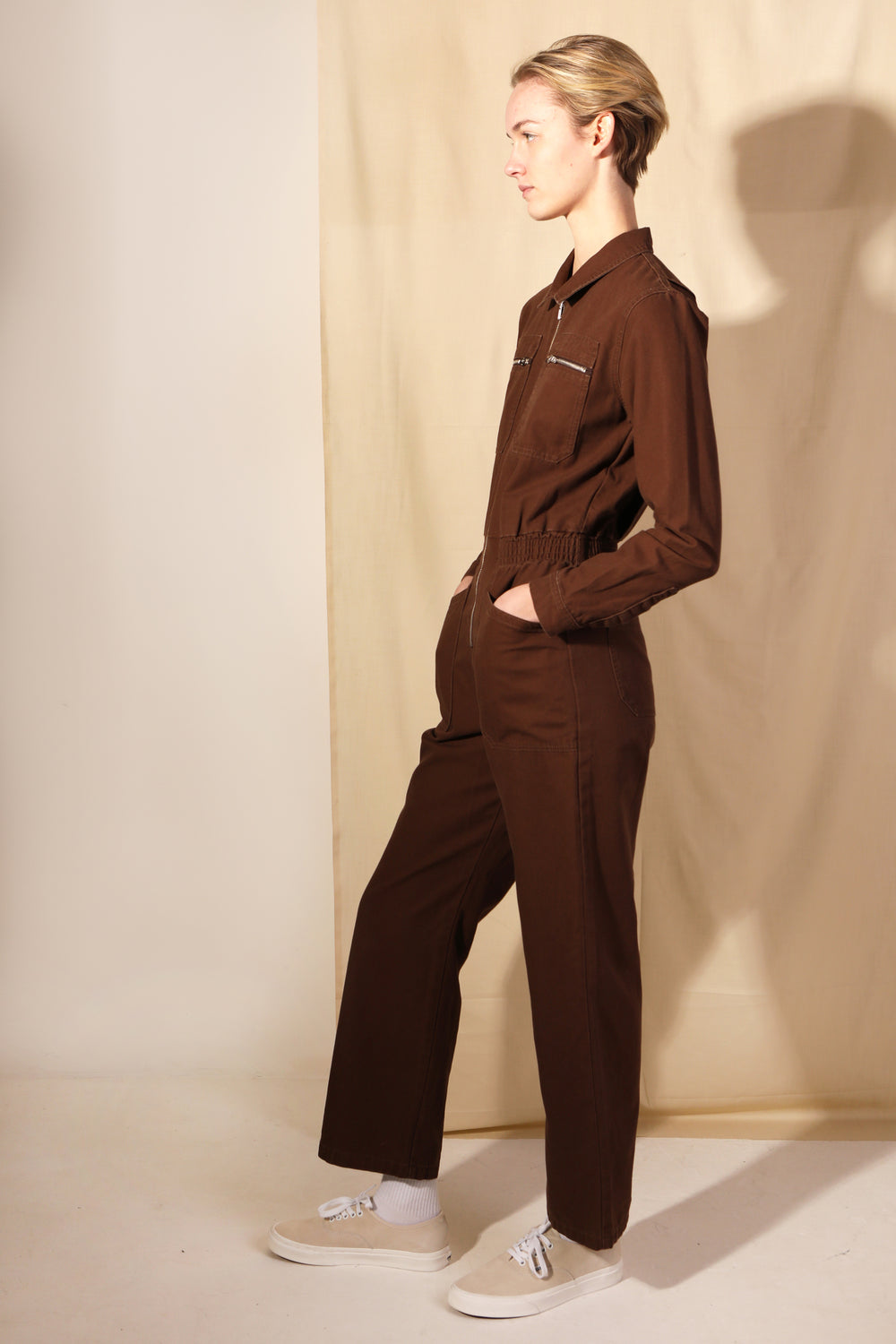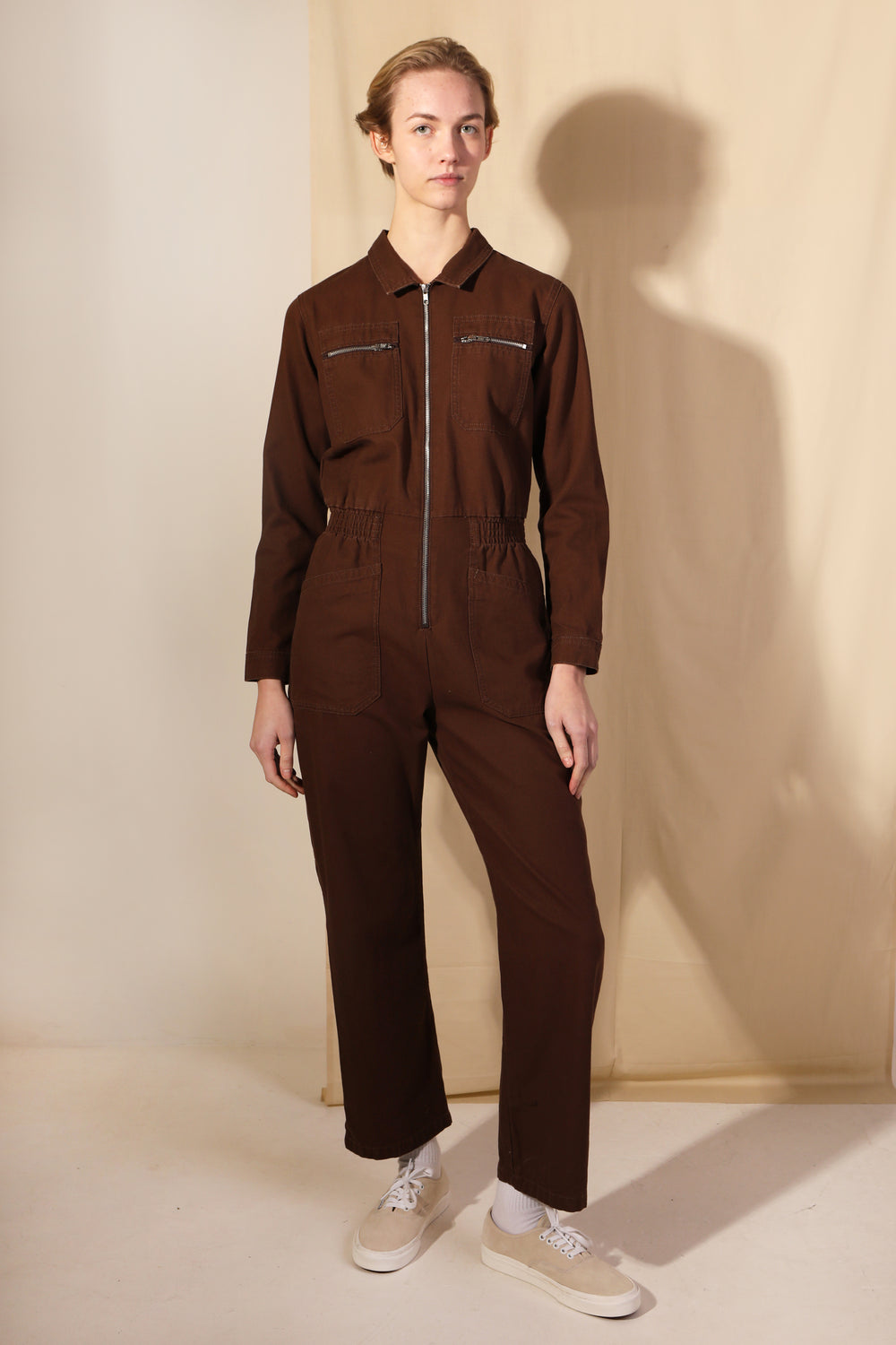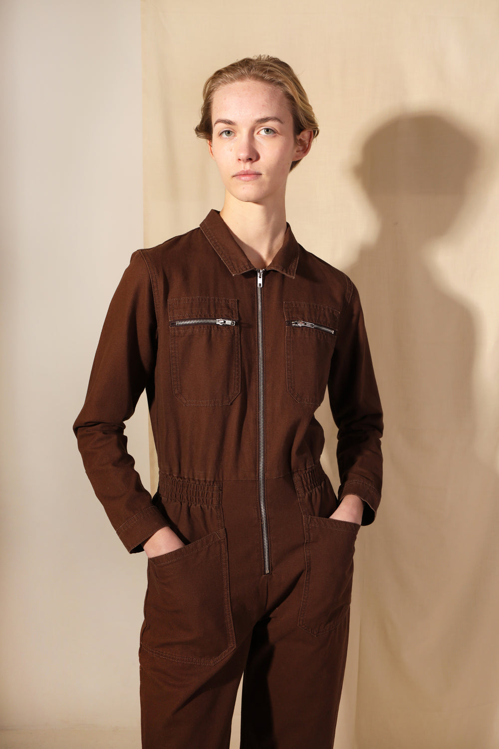 Chocolate brown version of our classic fitted boilersuit, now in 100% heavy weight, non-stretch cotton canvas. Features exposed zipper hardware and angular workwear style chest pockets. Elasticated at the waist with wide, straight legs.
