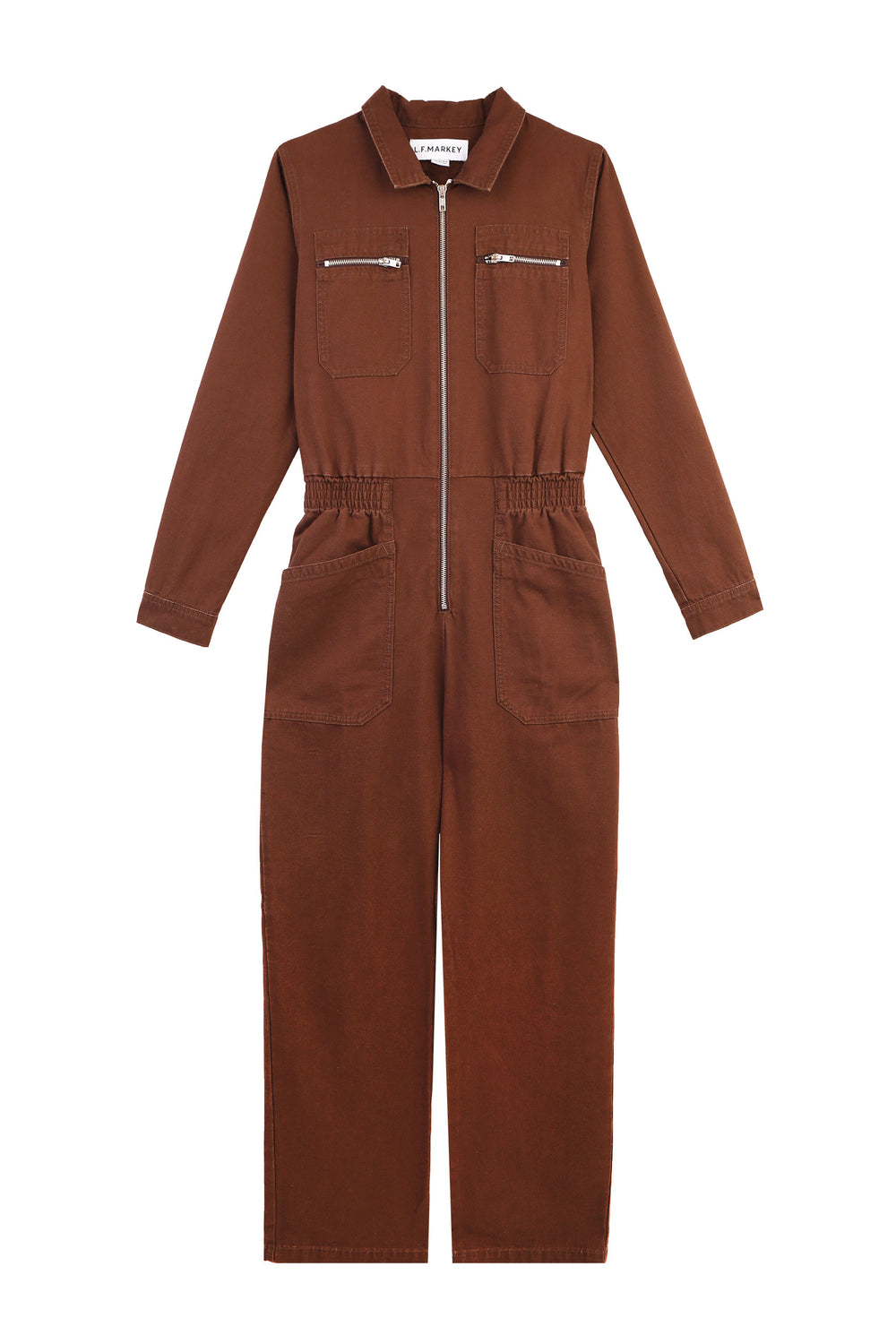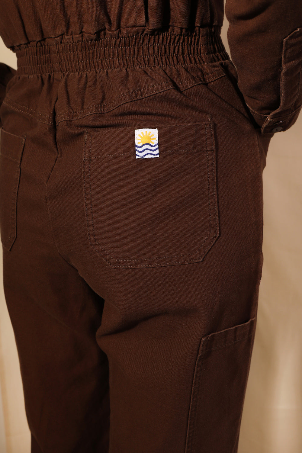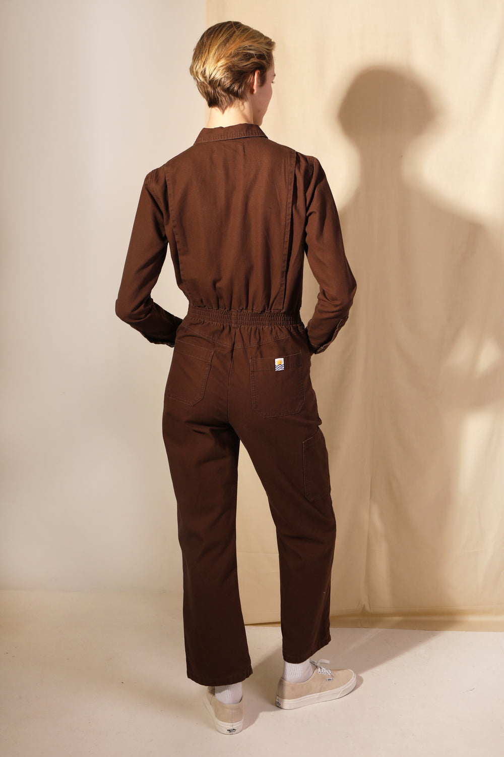 Chocolate brown version of our classic fitted boilersuit, now in 100% heavy weight, non-stretch cotton canvas. Features exposed zipper hardware and angular workwear style chest pockets. Elasticated at the waist with wide, straight legs.