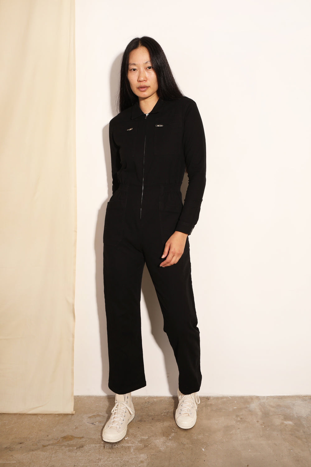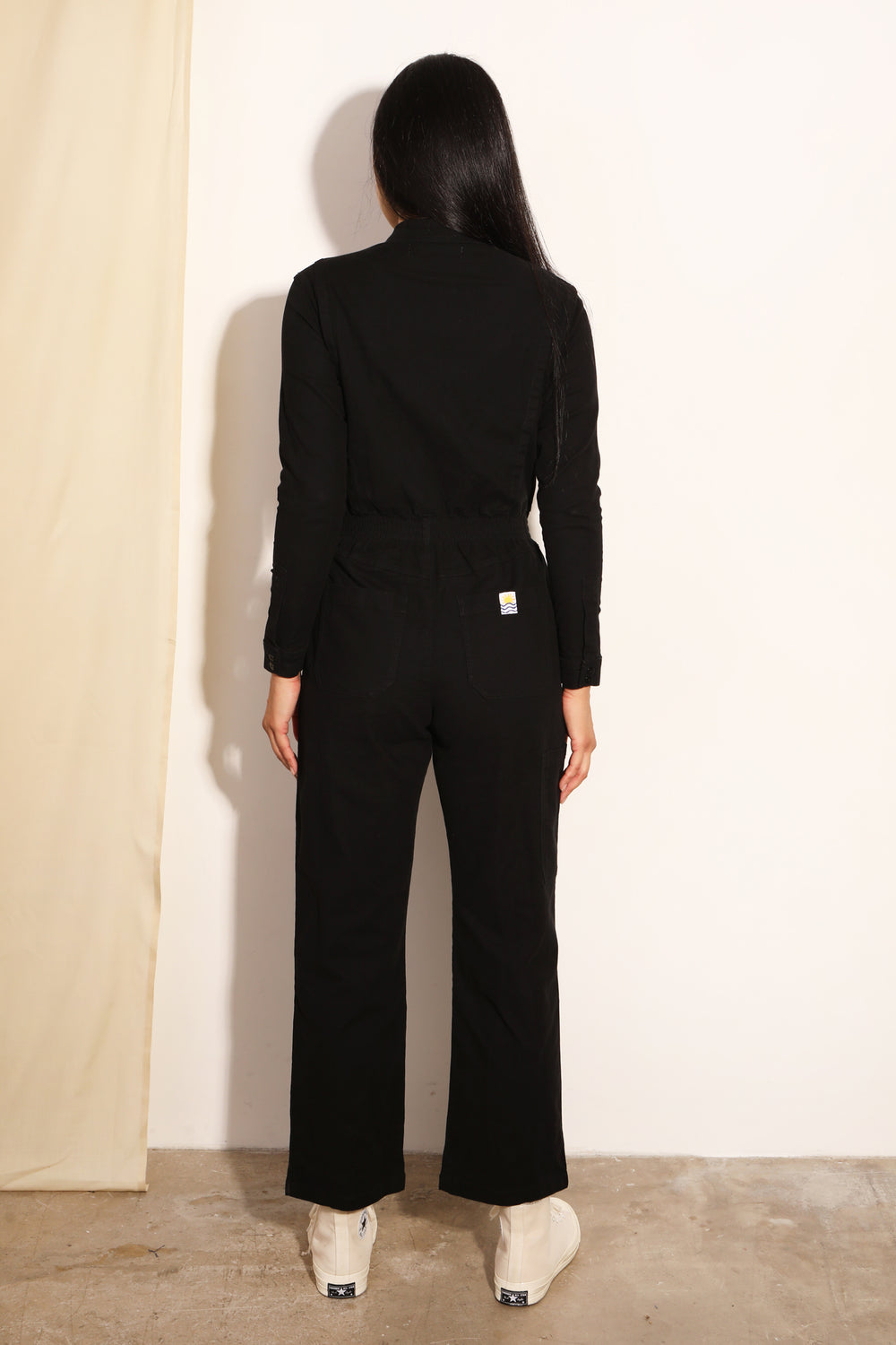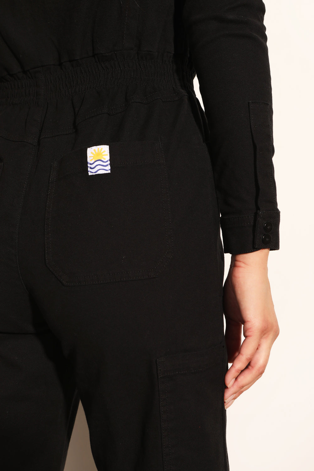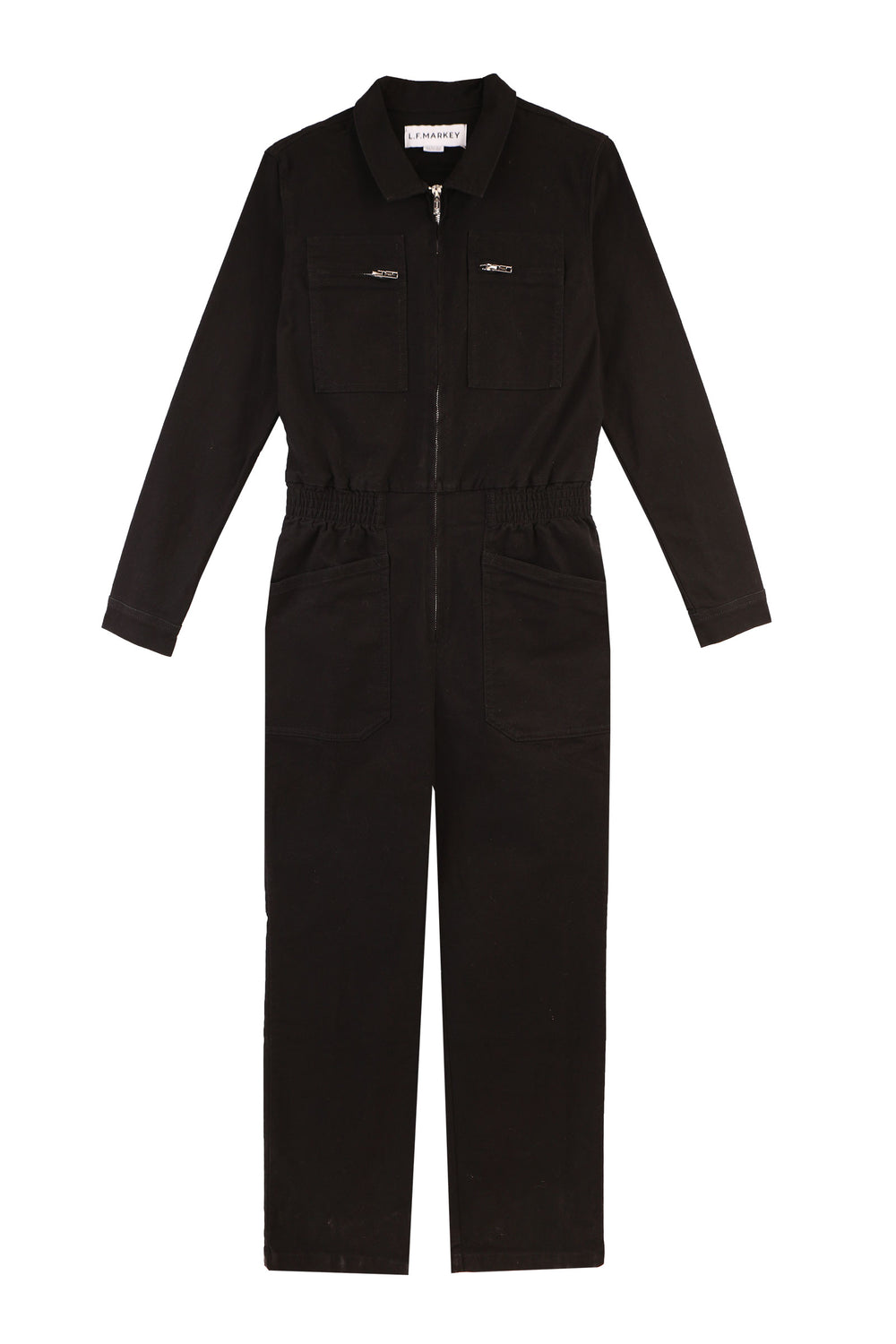 Black version of our classic fitted boilersuit. Elasticated at the waist with wide, straight legs. In heavy-weight cotton canvas with a small amount of stretch for a better fit.