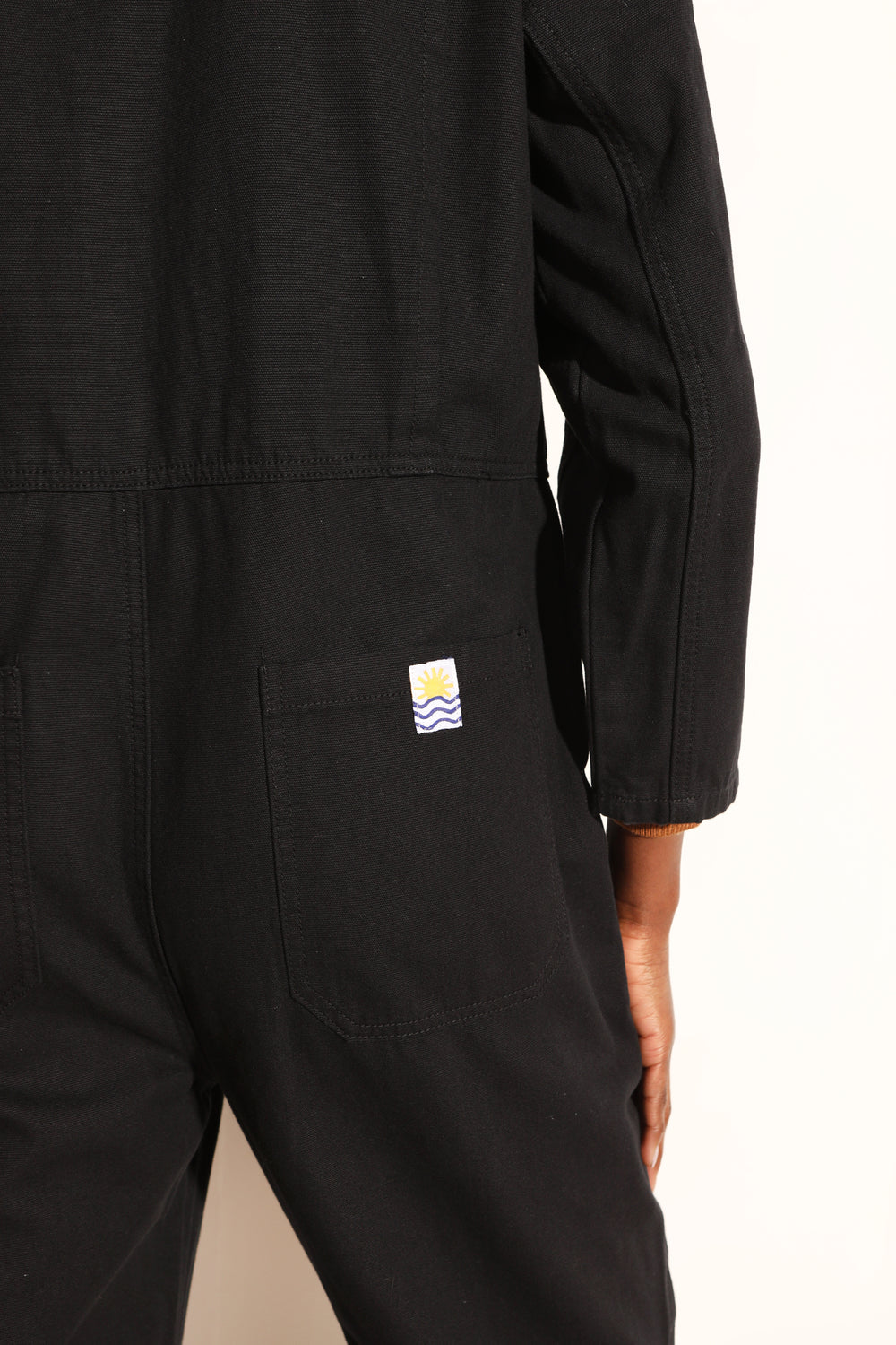The Dominic Boilersuit has a relaxed fit and a slightly tapered leg, with 3/4 length sleeves. In a classic black non-stretch cotton canvas, with large utility style pockets and a silver front zip.
