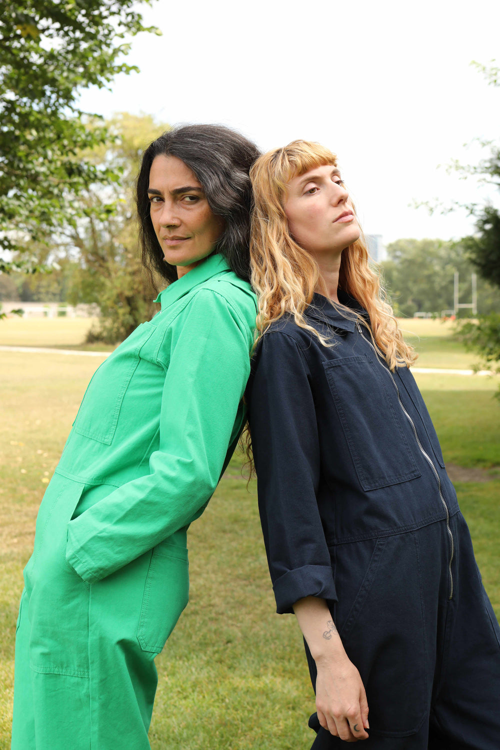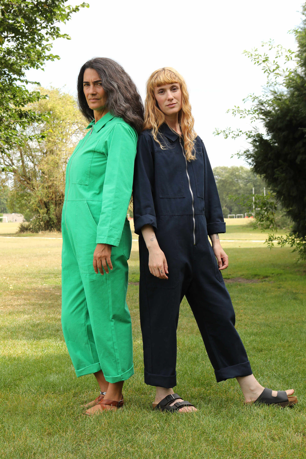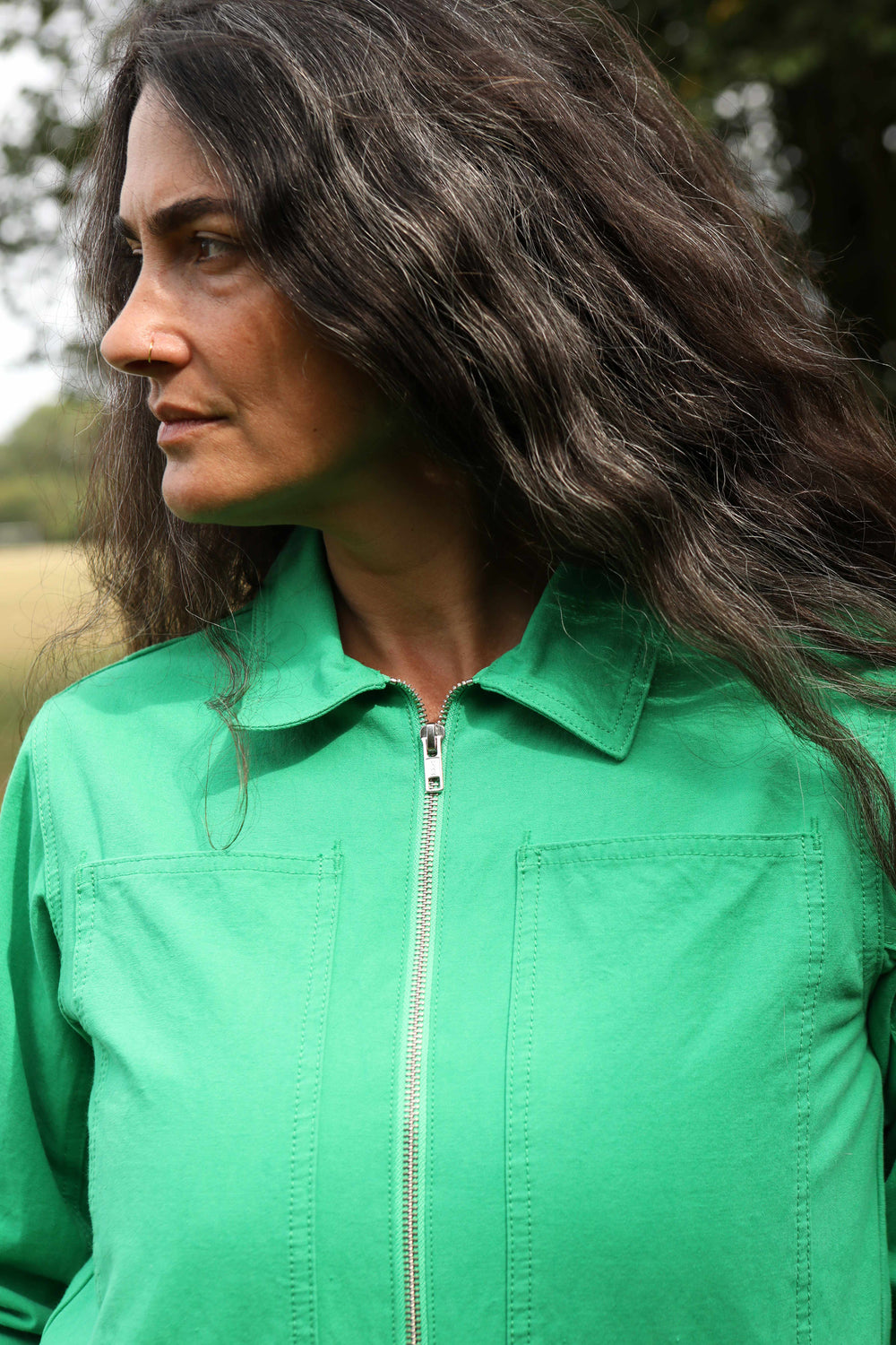 The Dominic Boilersuit has a relaxed fit and a slightly tapered leg, with 3/4 length sleeves. In a vibrant grass green non-stretch cotton canvas, with large utility style pockets and a silver front zip.