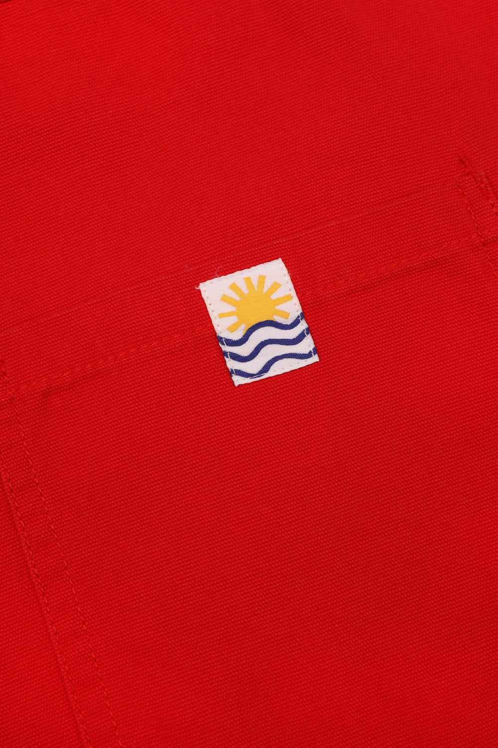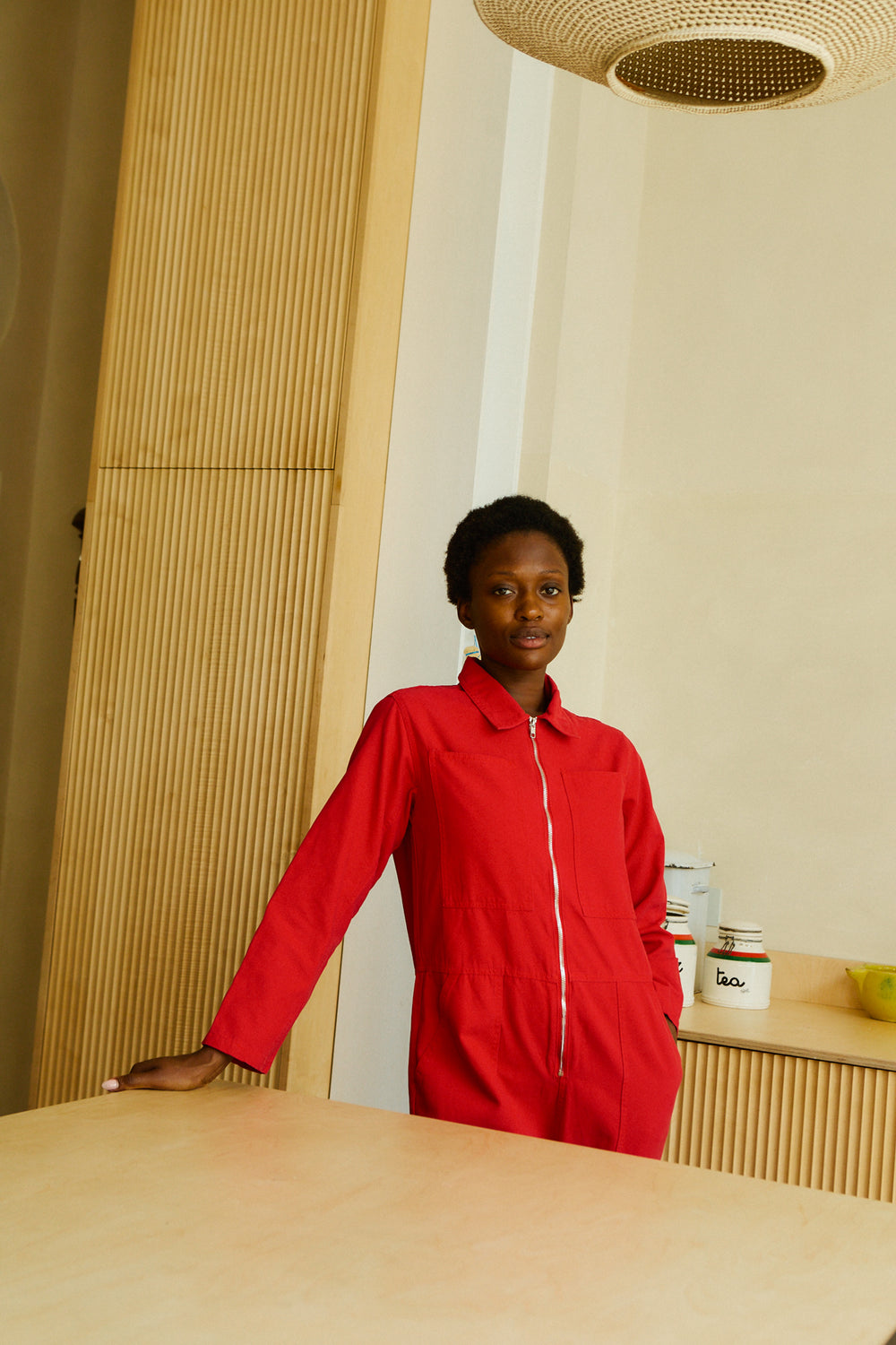 The Dominic Boilersuit has a relaxed fit and a slightly tapered leg, with 3/4 length sleeves. In a vibrant spice red non-stretch cotton canvas, with large utility style pockets and a silver front zip.