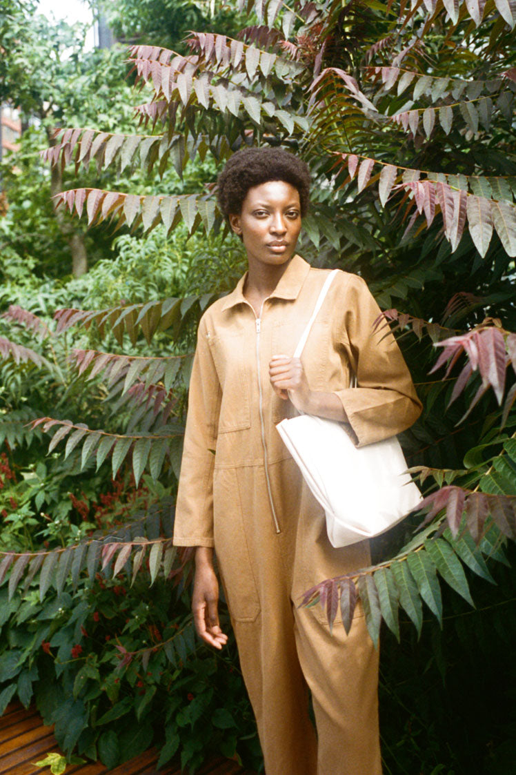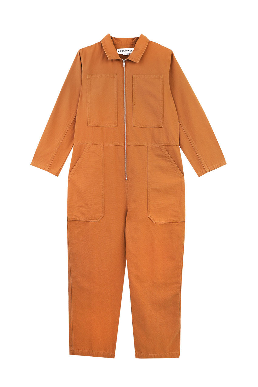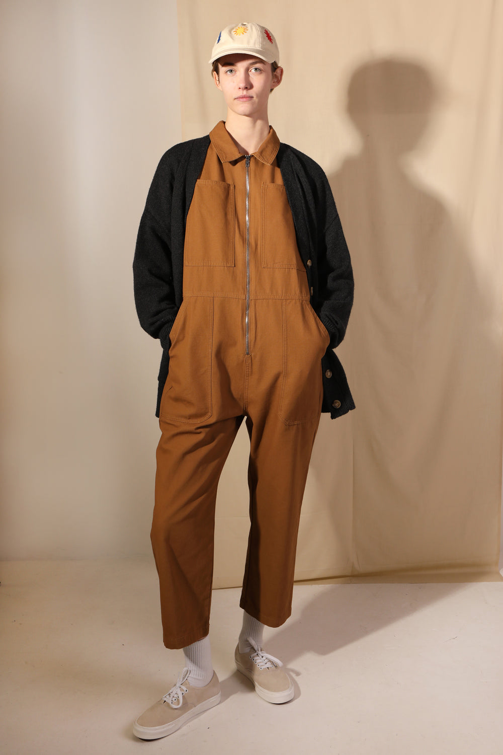 Workwear. Relaxed one-piece. Utility pockets. Zip-up. Tapered leg.