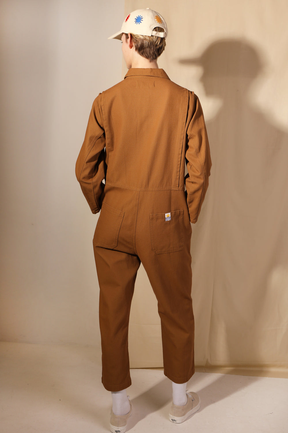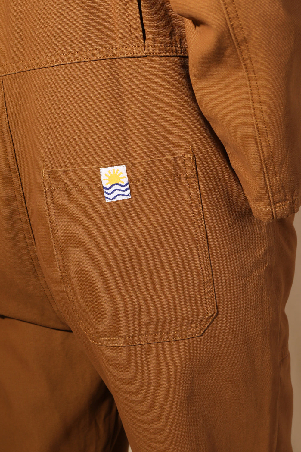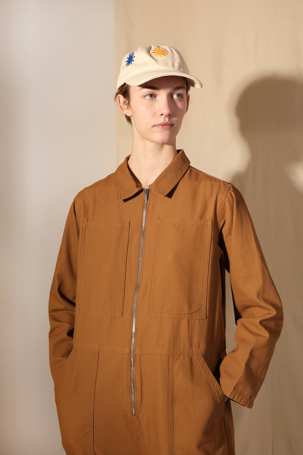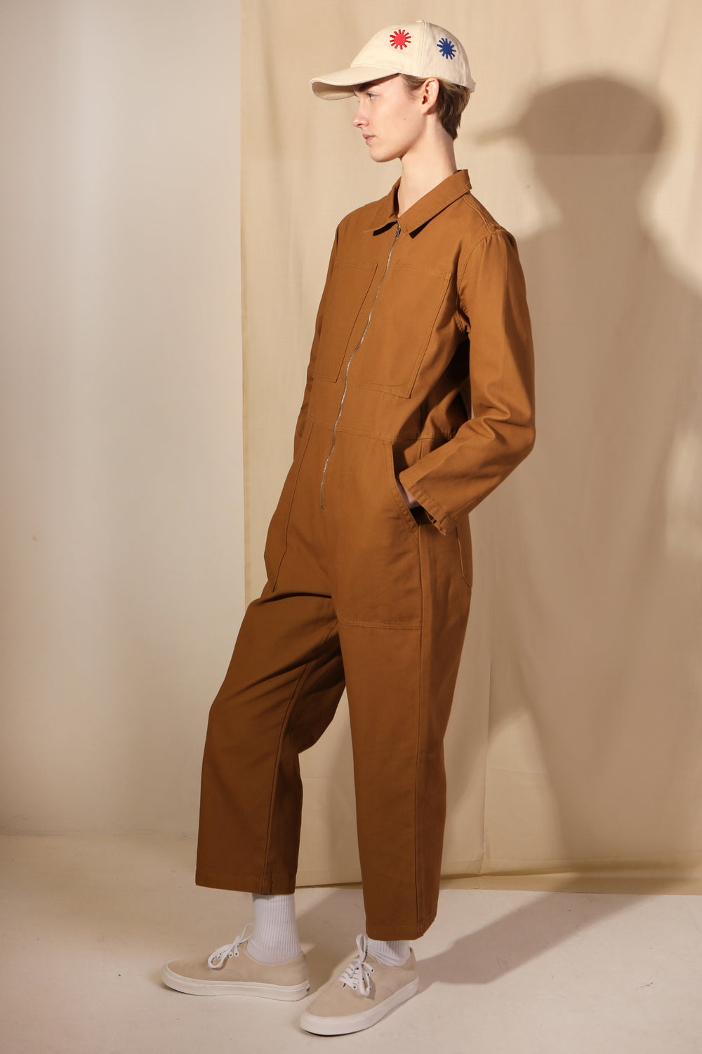 The Dominic Boilersuit has a relaxed fit and a slightly tapered leg, with 3/4 length sleeves. In a walnut brown non-stretch cotton canvas, with large utility style pockets and a silver front zip.