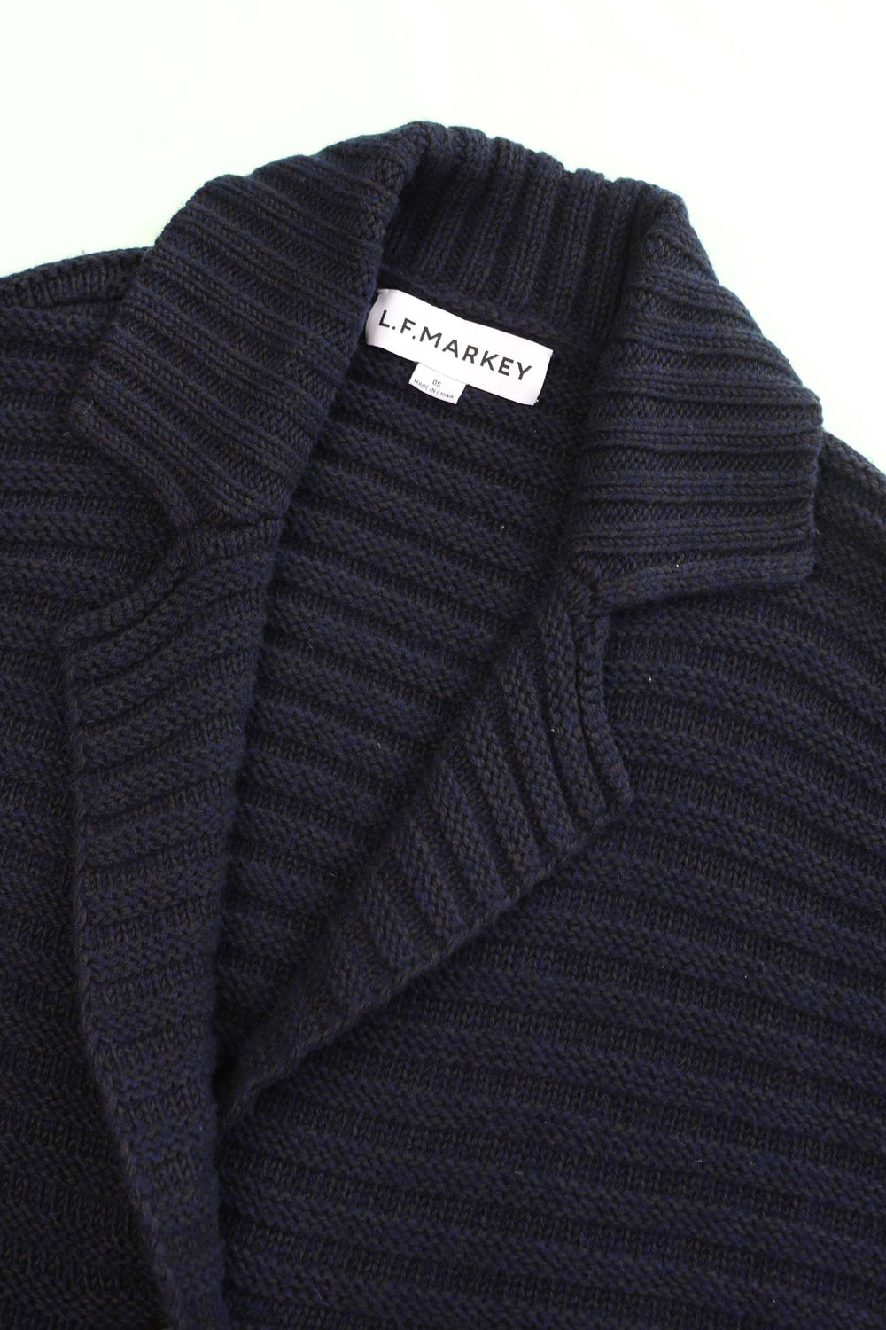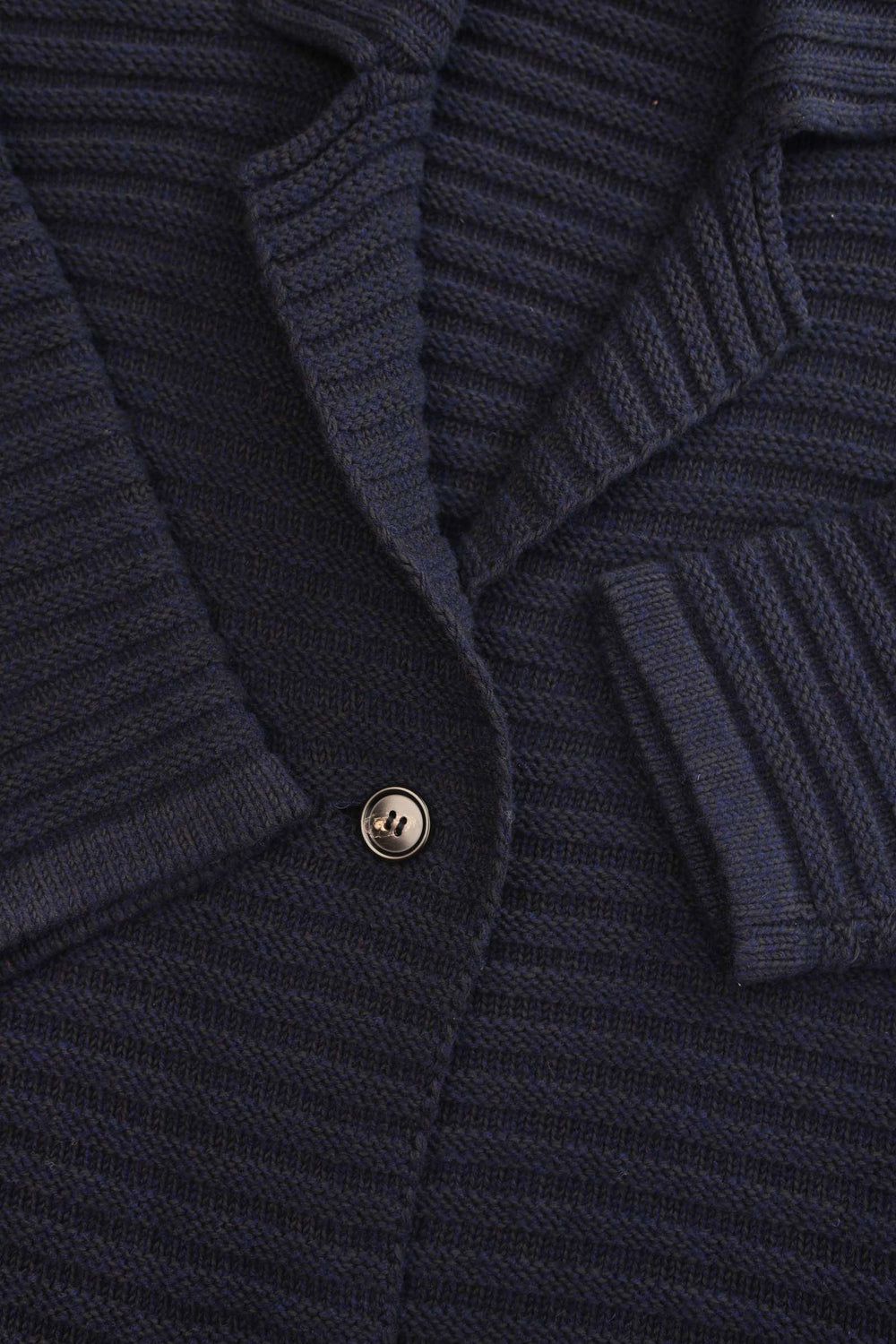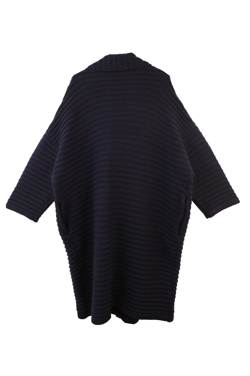 The Levy Knit is a chunky oversized knit overcoat, crafted from a midnight navy hued wool blend yarn in an allover horizontal rib stitch which adds texture and dimension to its simple cocoon shape. Features a notched collar fastened with two buttons on the front, dropped shoulder and side seam pockets. Falls to mid-thigh length, an ideal overcoat for transitional seasons.