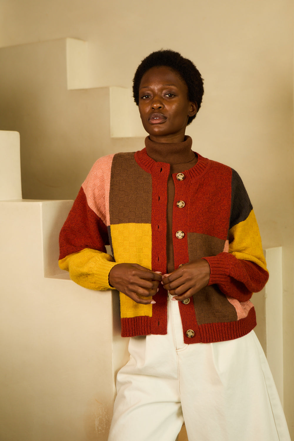 The Lonny Cardigan is a relaxed fit cardigan, knitted with a playful patchwork of wool blend yarns in a basketweave pattern. Shaped with a crew neck, dropped shoulder, with voluminous sleeves and imitation horn buttons. Falls to high-hip length with a ribbed hem and cuffs.
