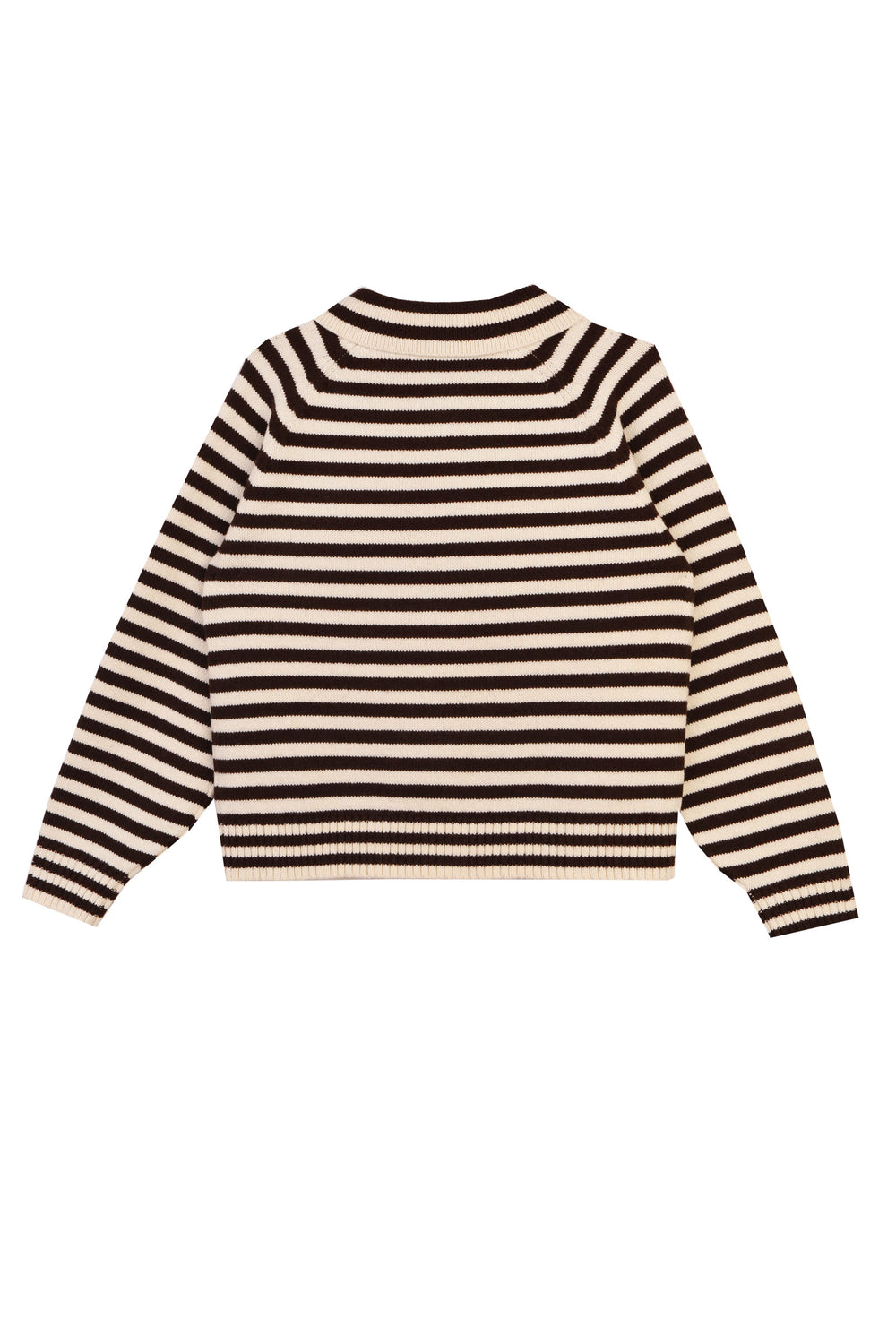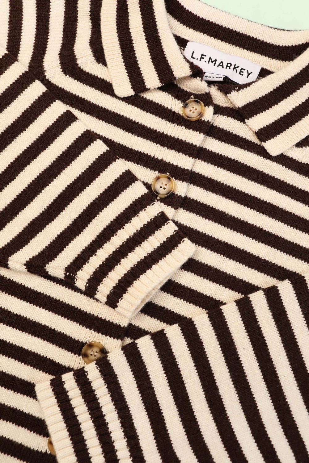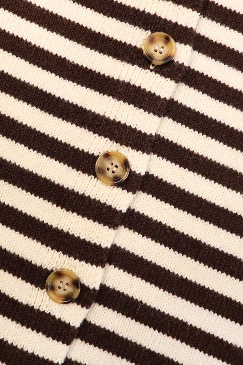 The Lytton Cardigan is a boxy raglan-sleeved knit with a relaxed fit, inspired by heritage sportswear. Crafted from a wool blend in an ecru and espresso brown stripe pattern that continue in the ribbed cuffs and hem. Features a wide ribbed collar and imitation tortoiseshell buttons down the front.