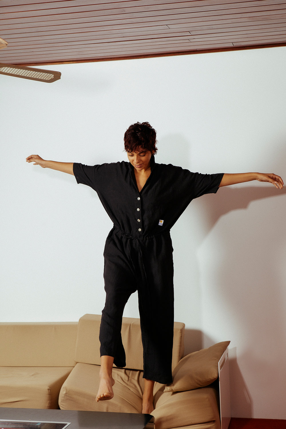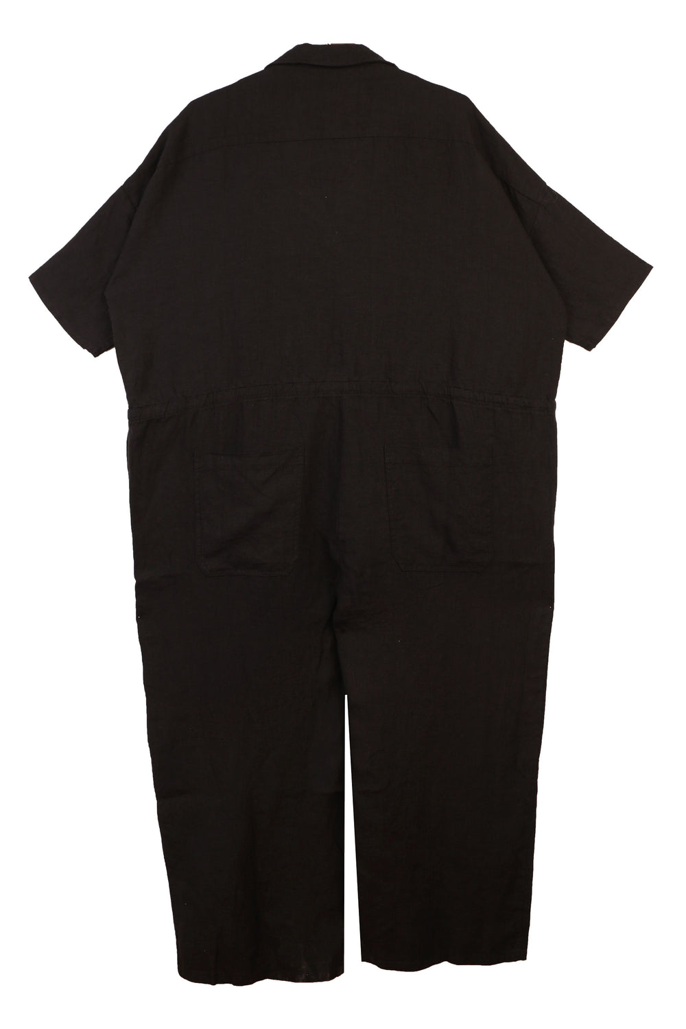 Linen jumpsuit. Tortoise-shell buttons. 3/4 length sleeves. Large patch pocket.
