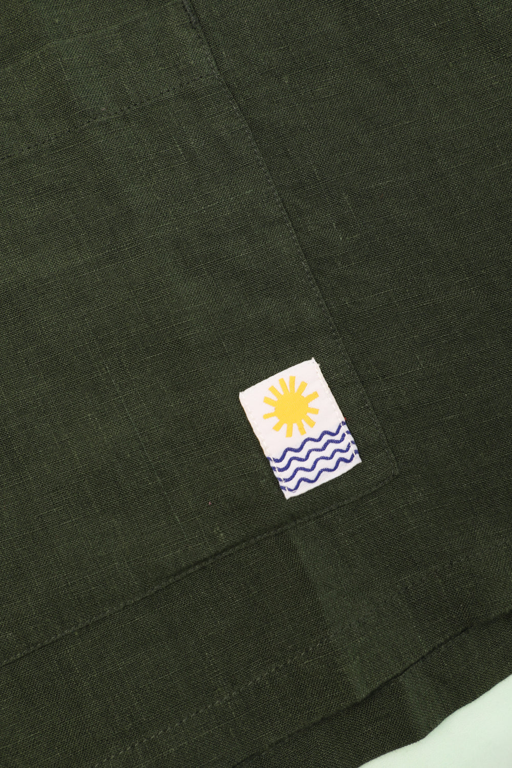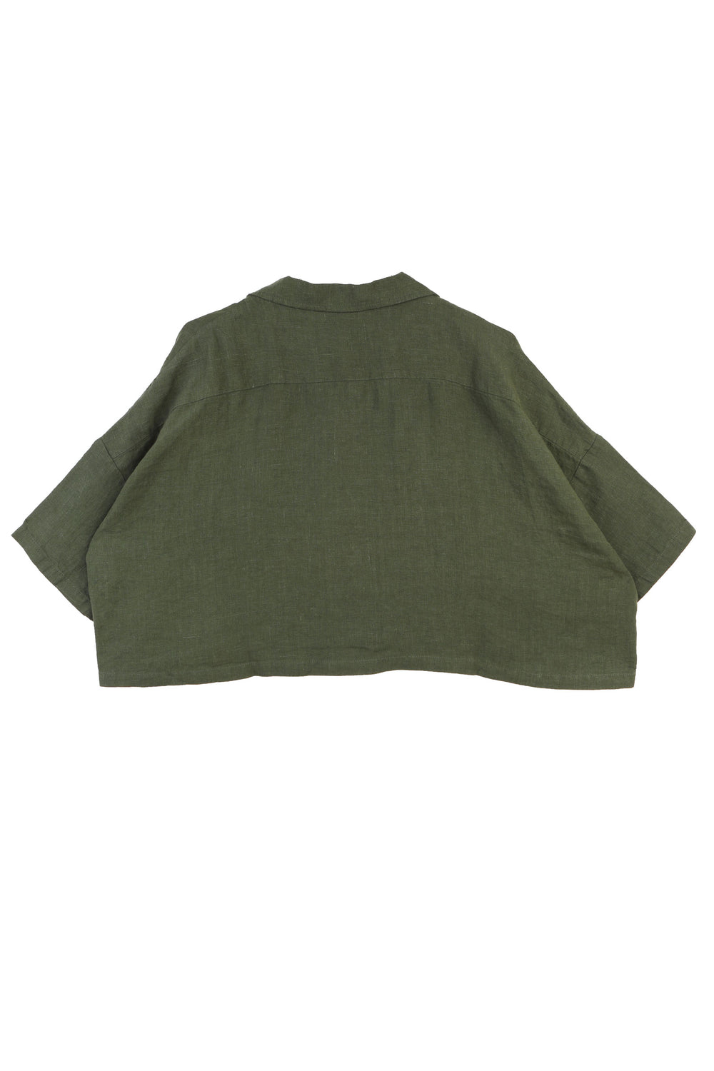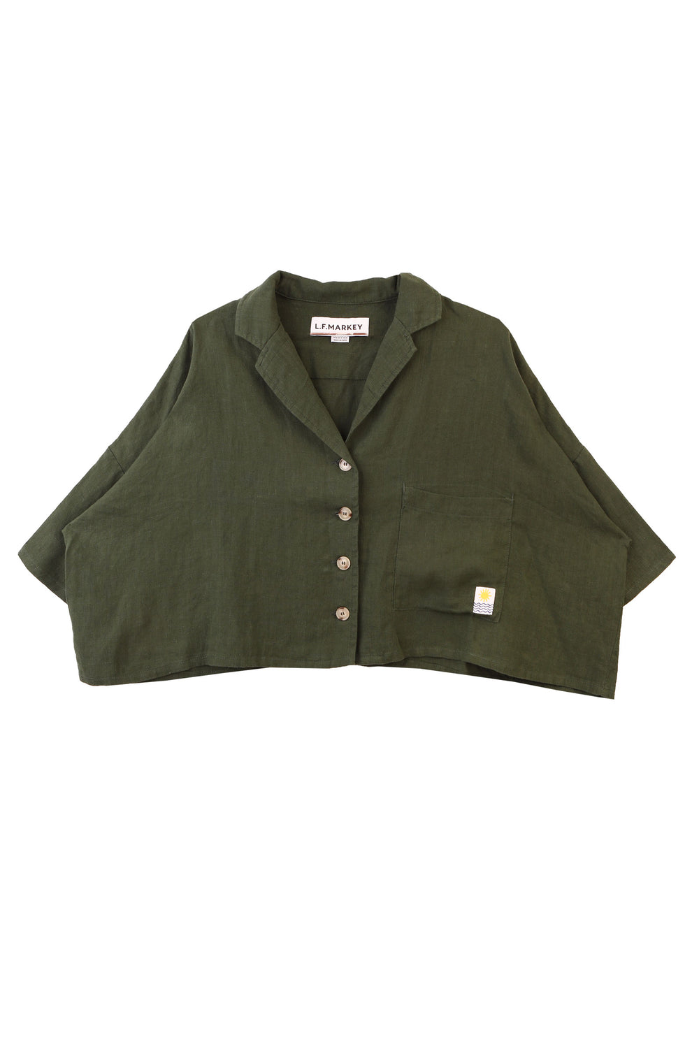 Boxy wide-cut cropped shirt made with a soft lightweight linen. With a low neck and tortoise-shell buttons down the front. 3/4 length sleeves and our signature small sun and wave woven patch.