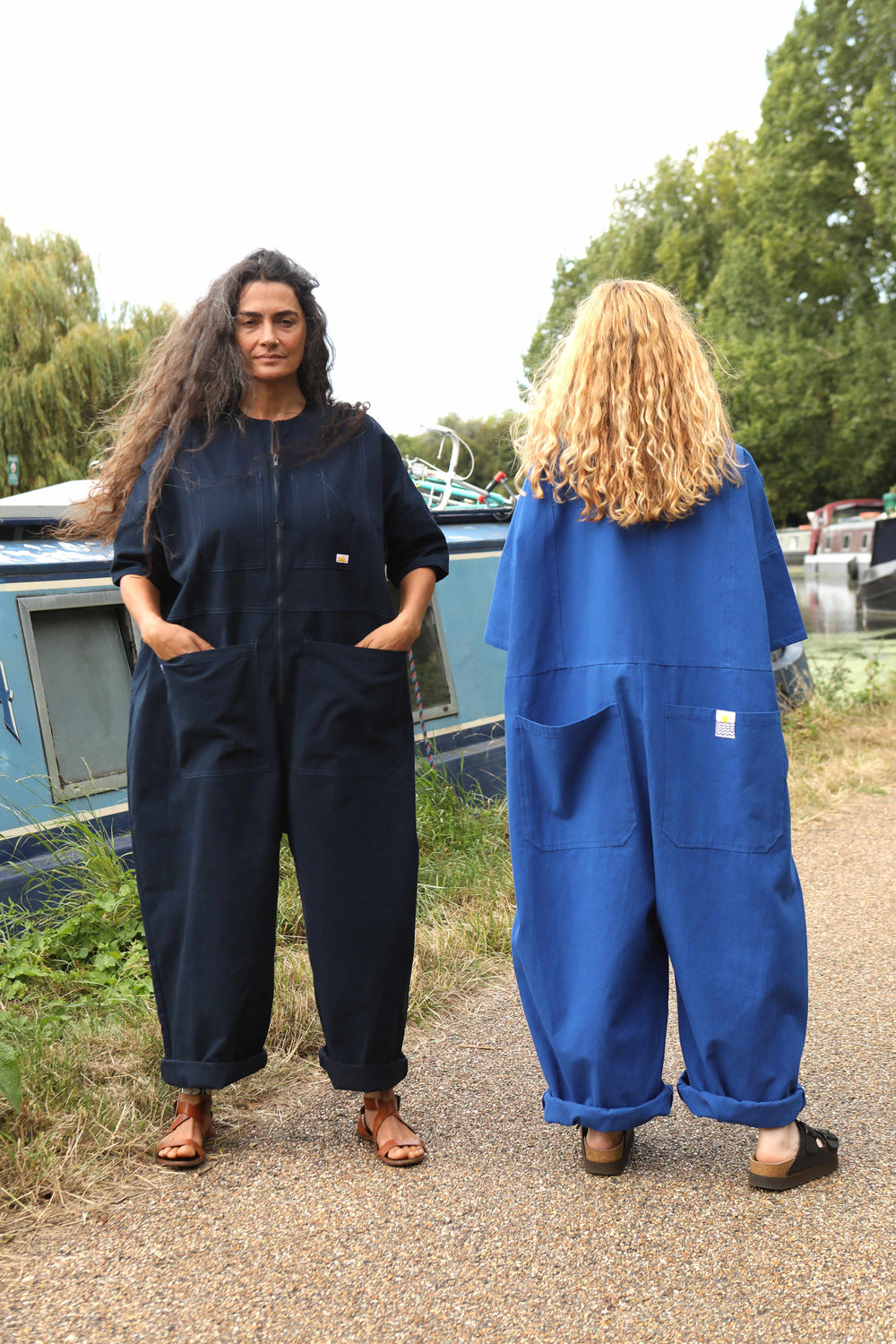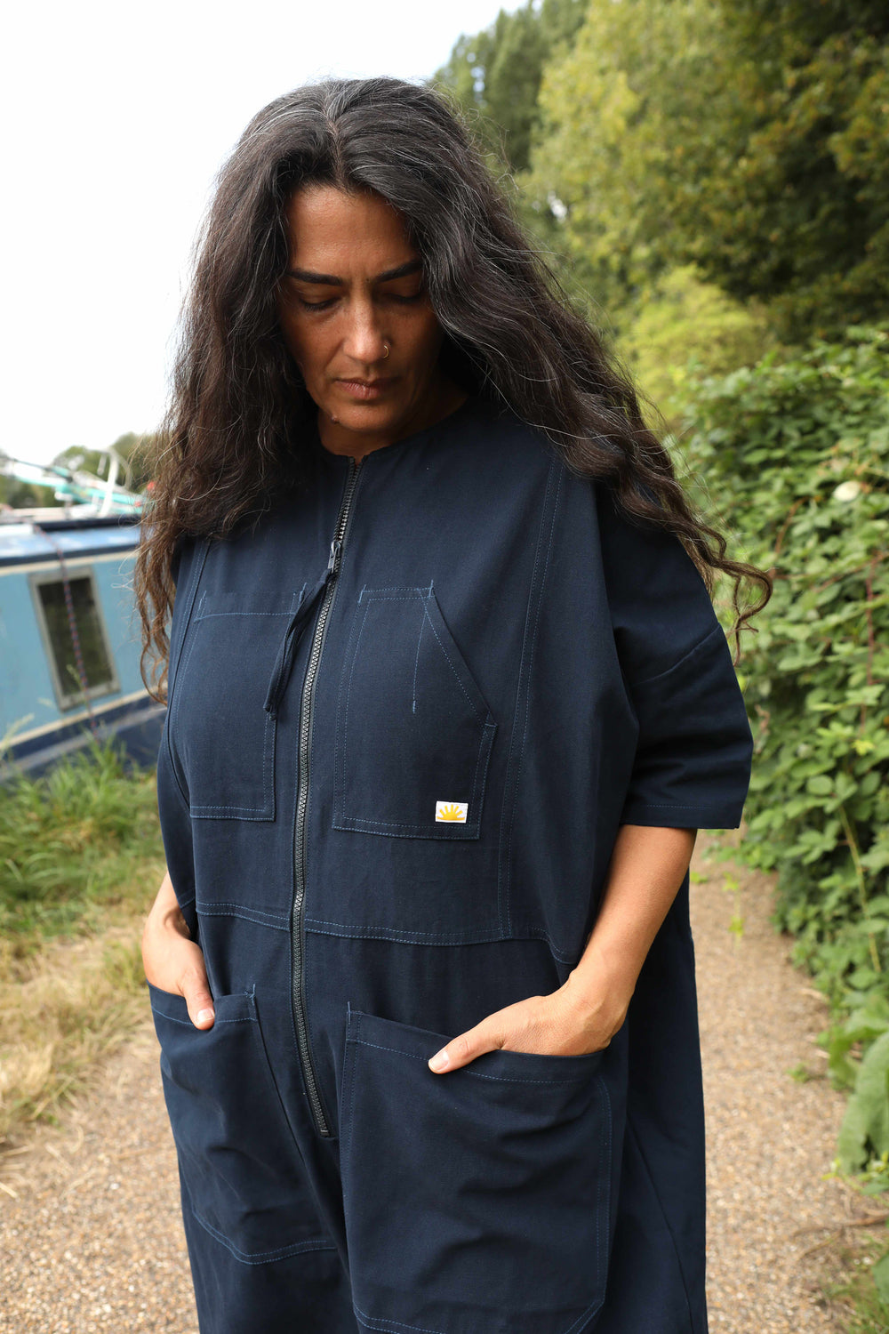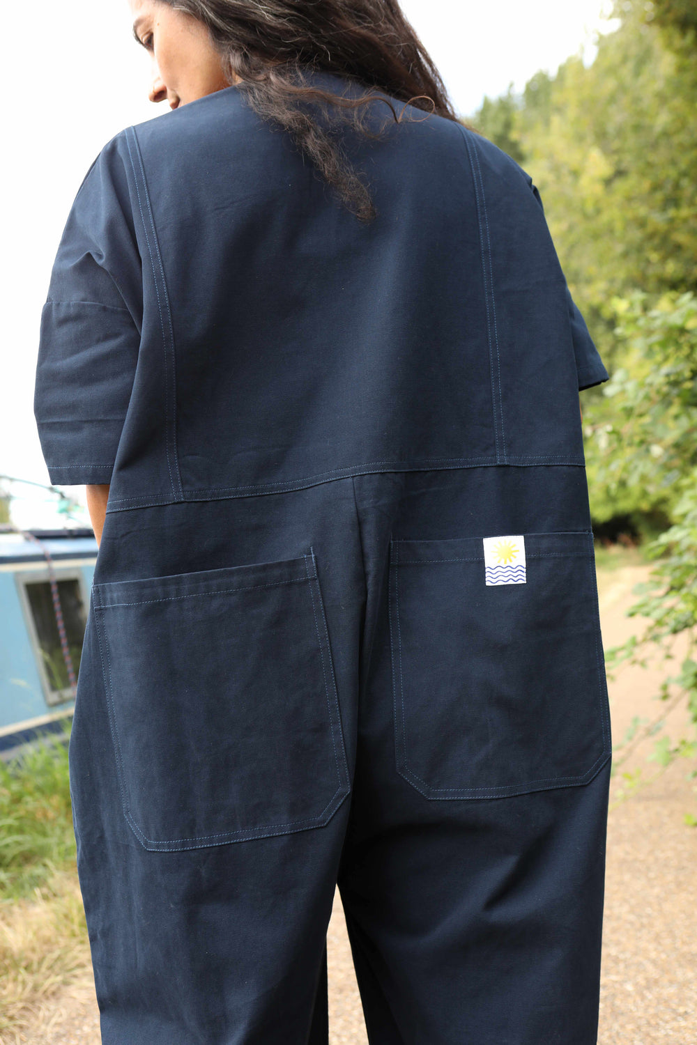 Mega oversized boilersuit in navy blue cotton canvas. Spacious relaxed fit, with plenty of room for movement and play. Features a matching front zipper, utility style pockets aplenty and our mini wave and mini sun woven patch logos.