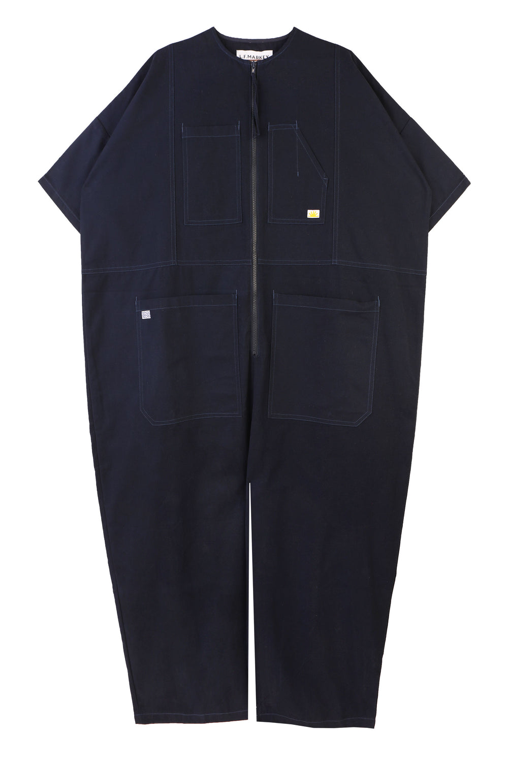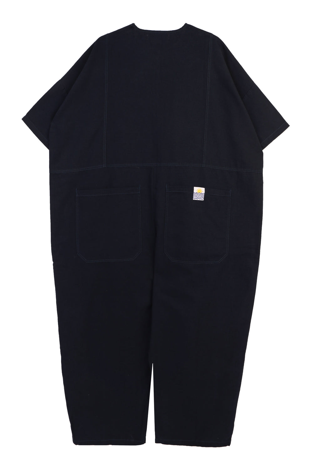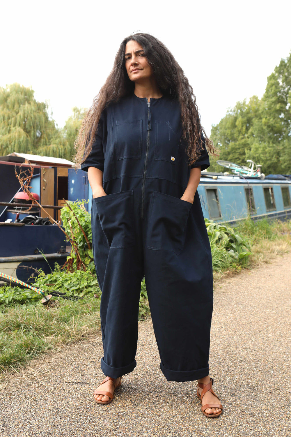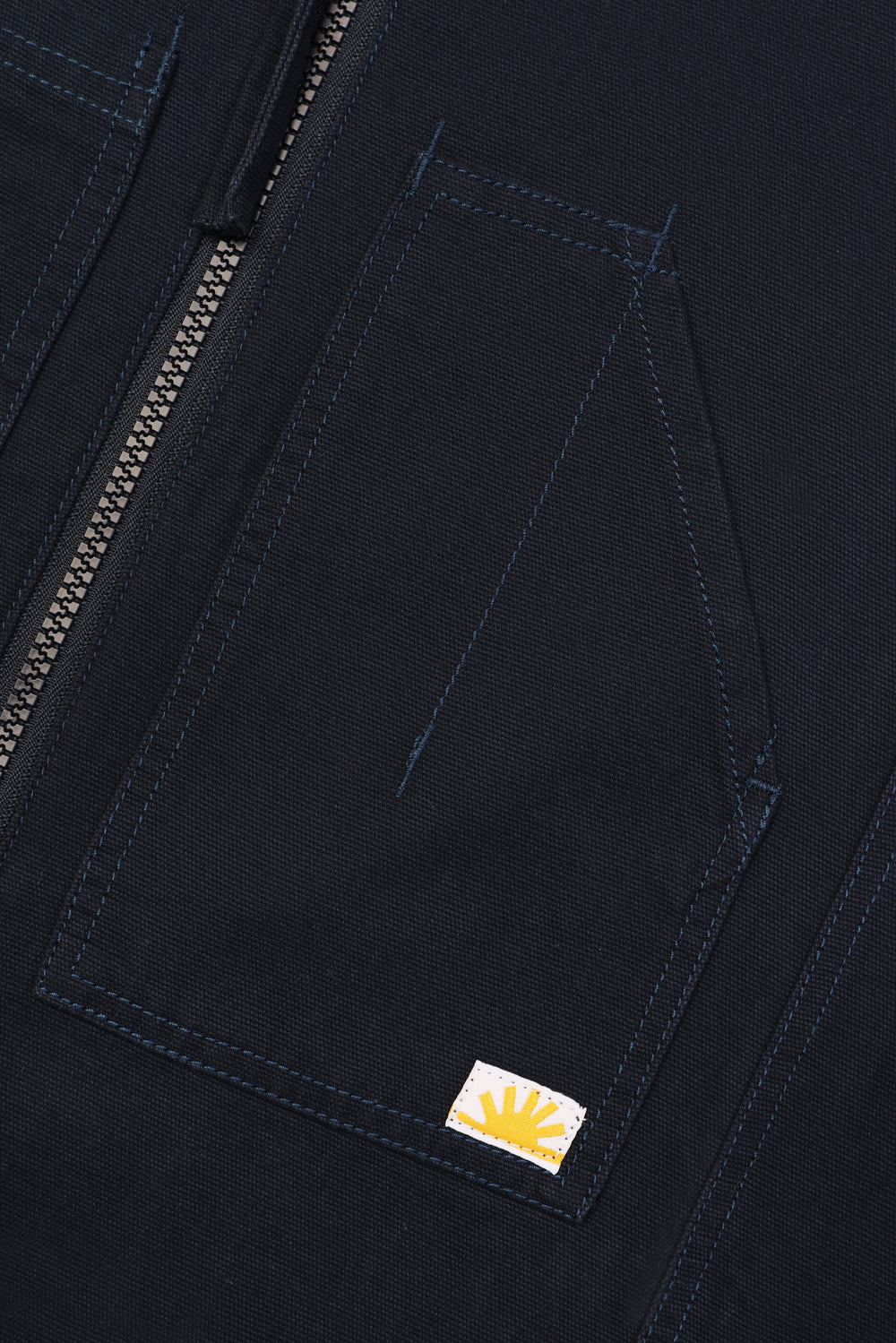Mega oversized boilersuit in navy blue cotton canvas. Spacious relaxed fit, with plenty of room for movement and play. Features a matching front zipper, utility style pockets aplenty and our mini wave and mini sun woven patch logos.