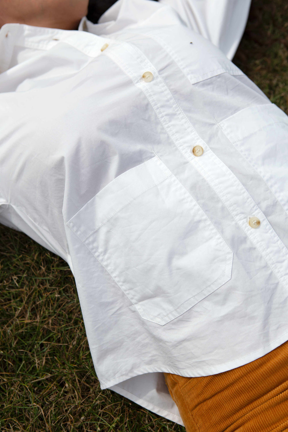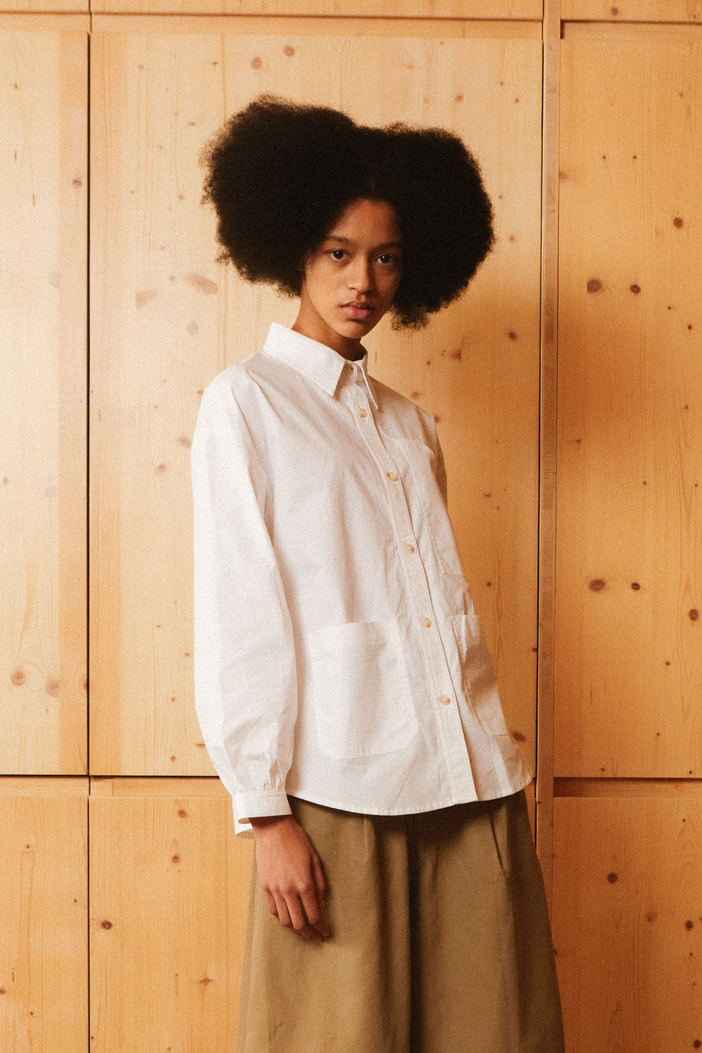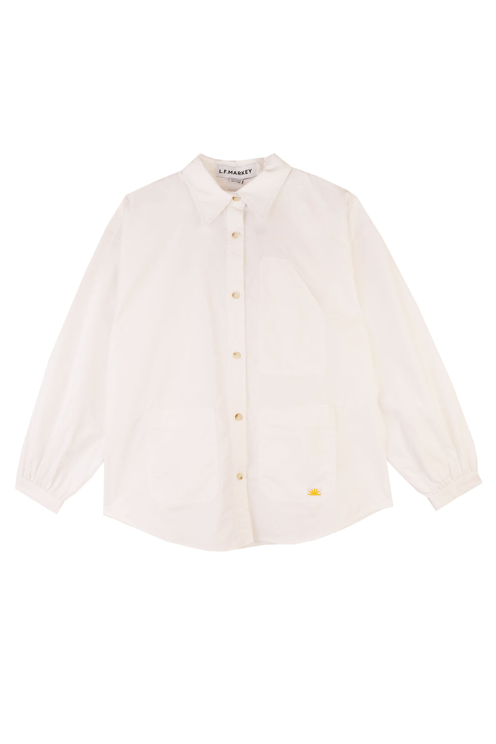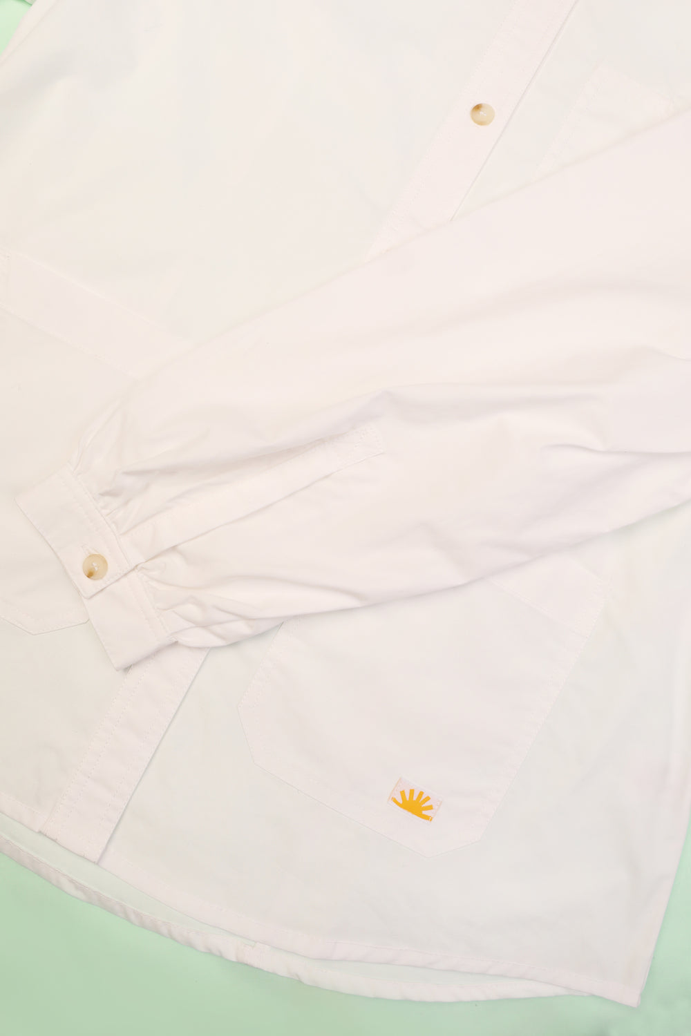 Workwear inspired, crisp white shirt with utility-style patch pockets and a curved hem. With side button tabs to adjust volume at the back and our mini sun woven patch logo.