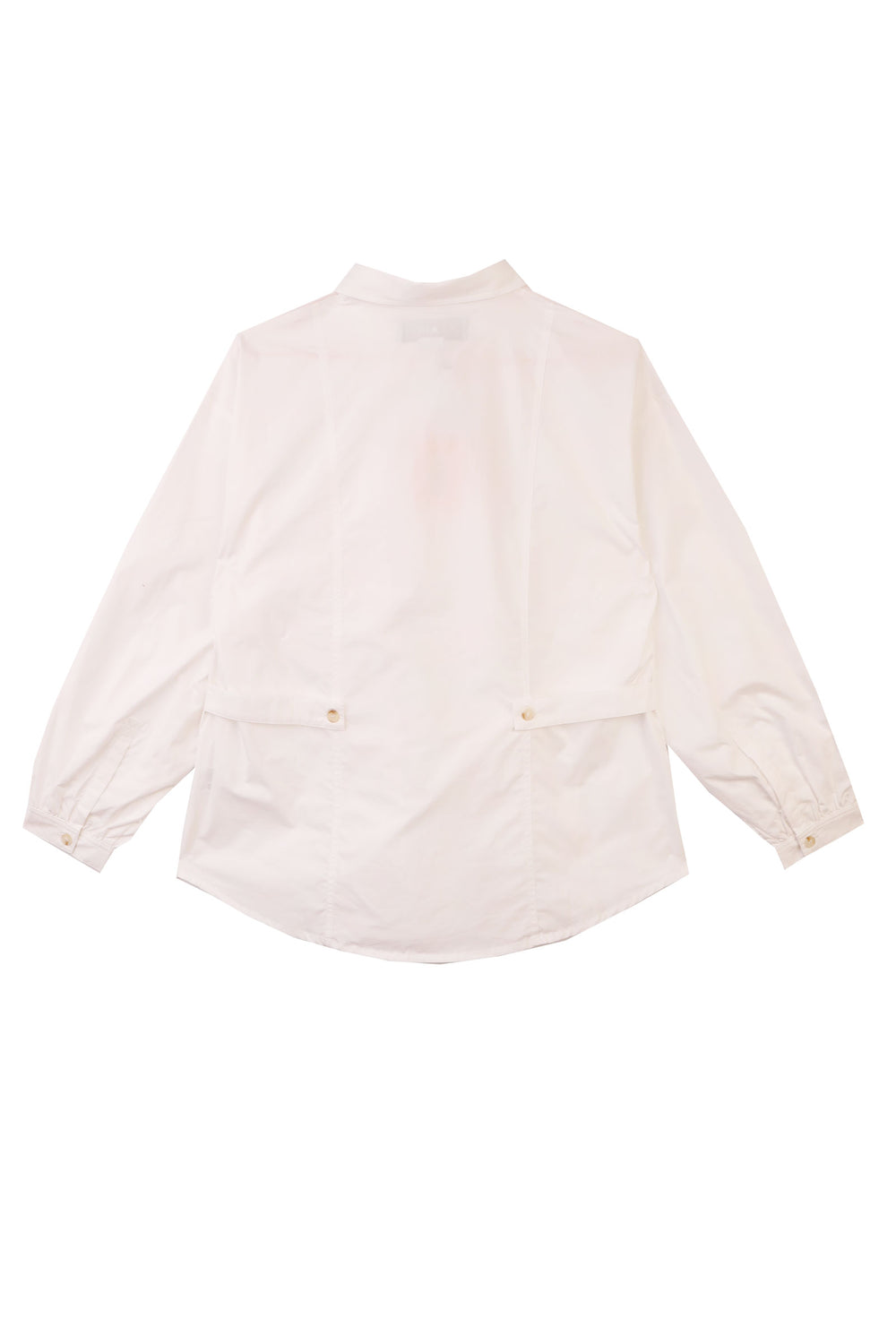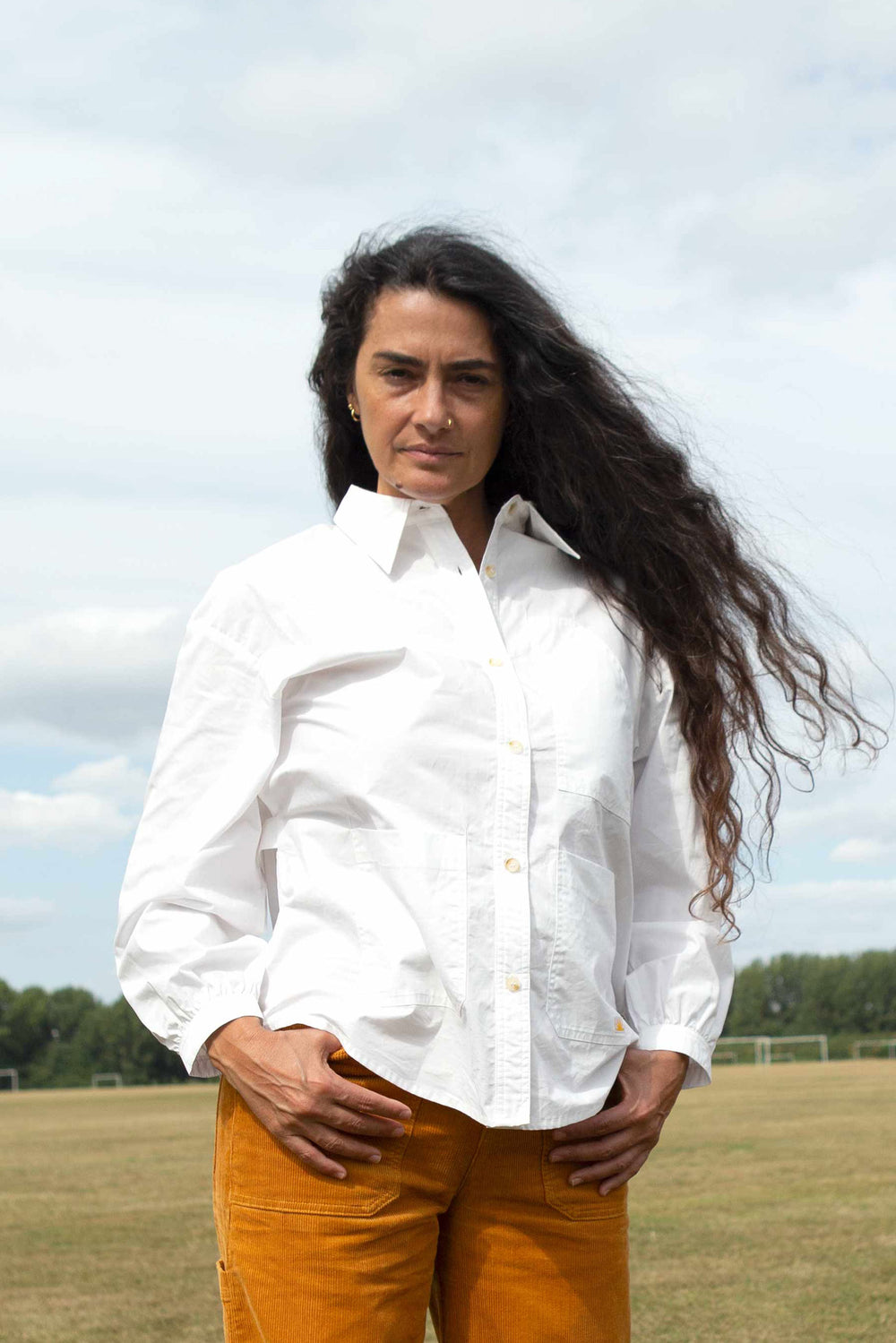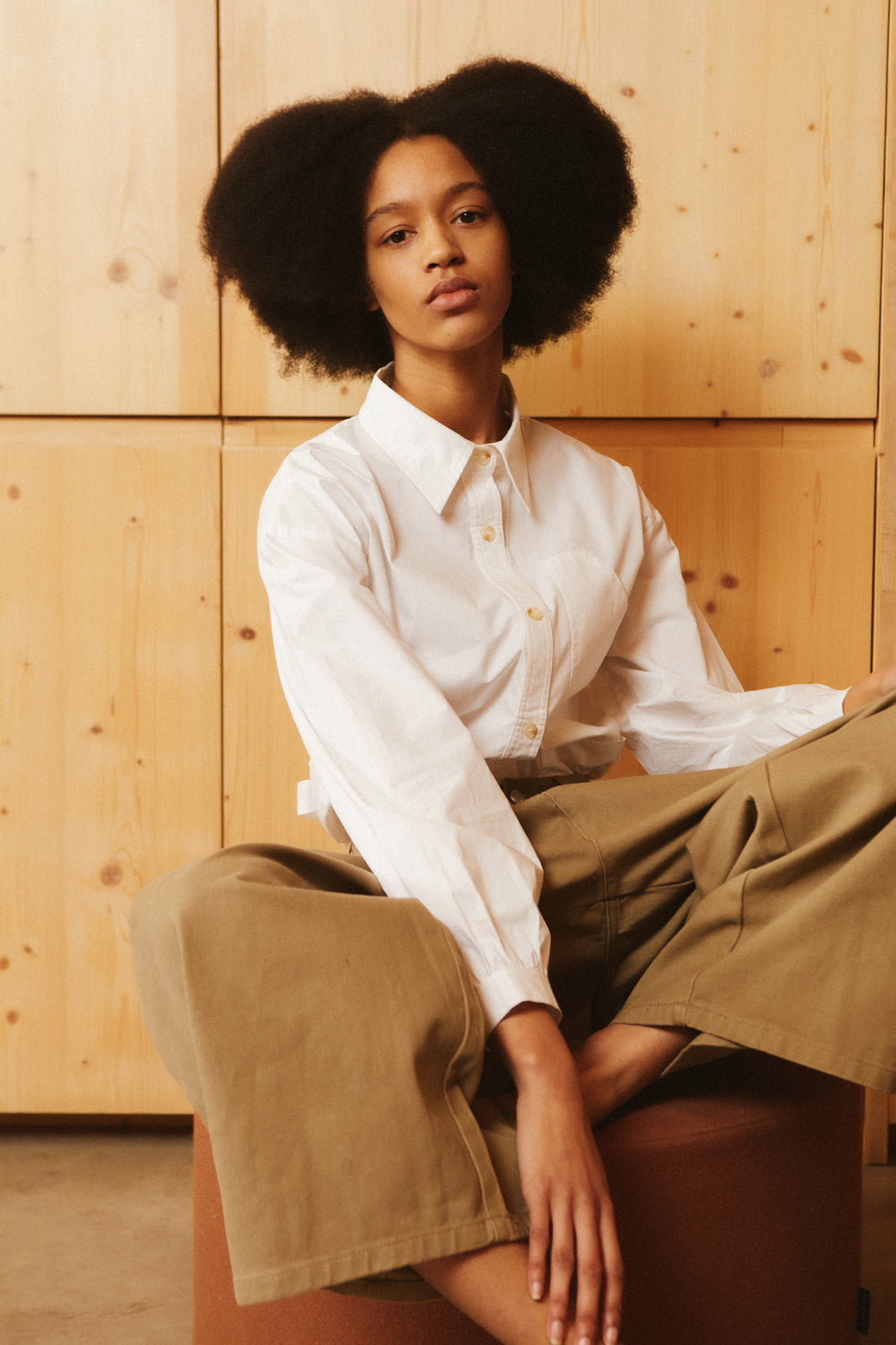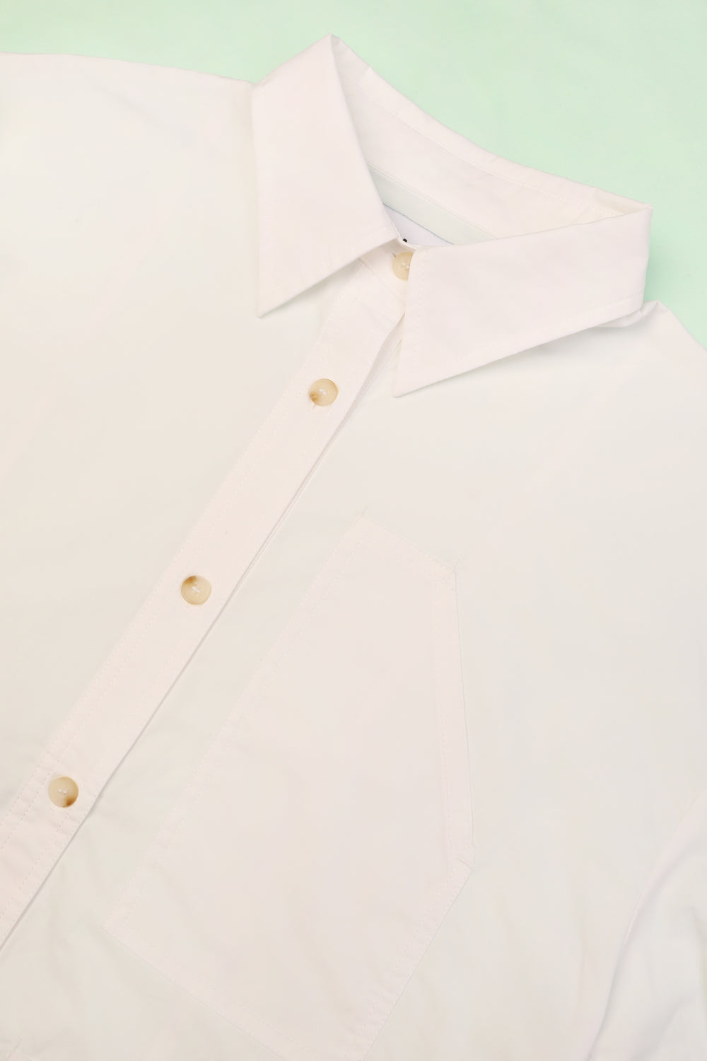 Workwear inspired, crisp white shirt with utility-style patch pockets and a curved hem. With side button tabs to adjust volume at the back and our mini sun woven patch logo.