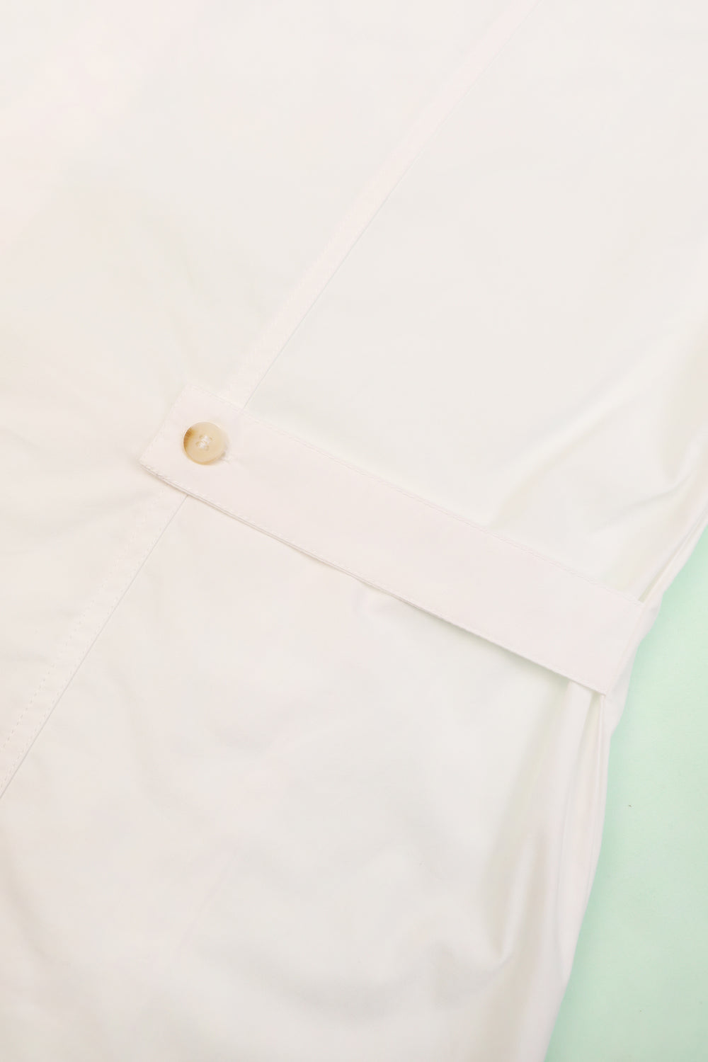 White shirt. Straight cut. Curved hem. Utility pockets.