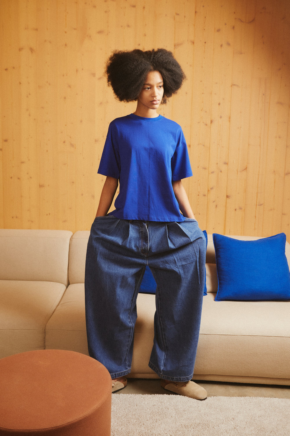 High-waisted pleat front jeans in robust, heavyweight mid-blue denim. Features utility pocket detailing and contrast ochre topstitching.