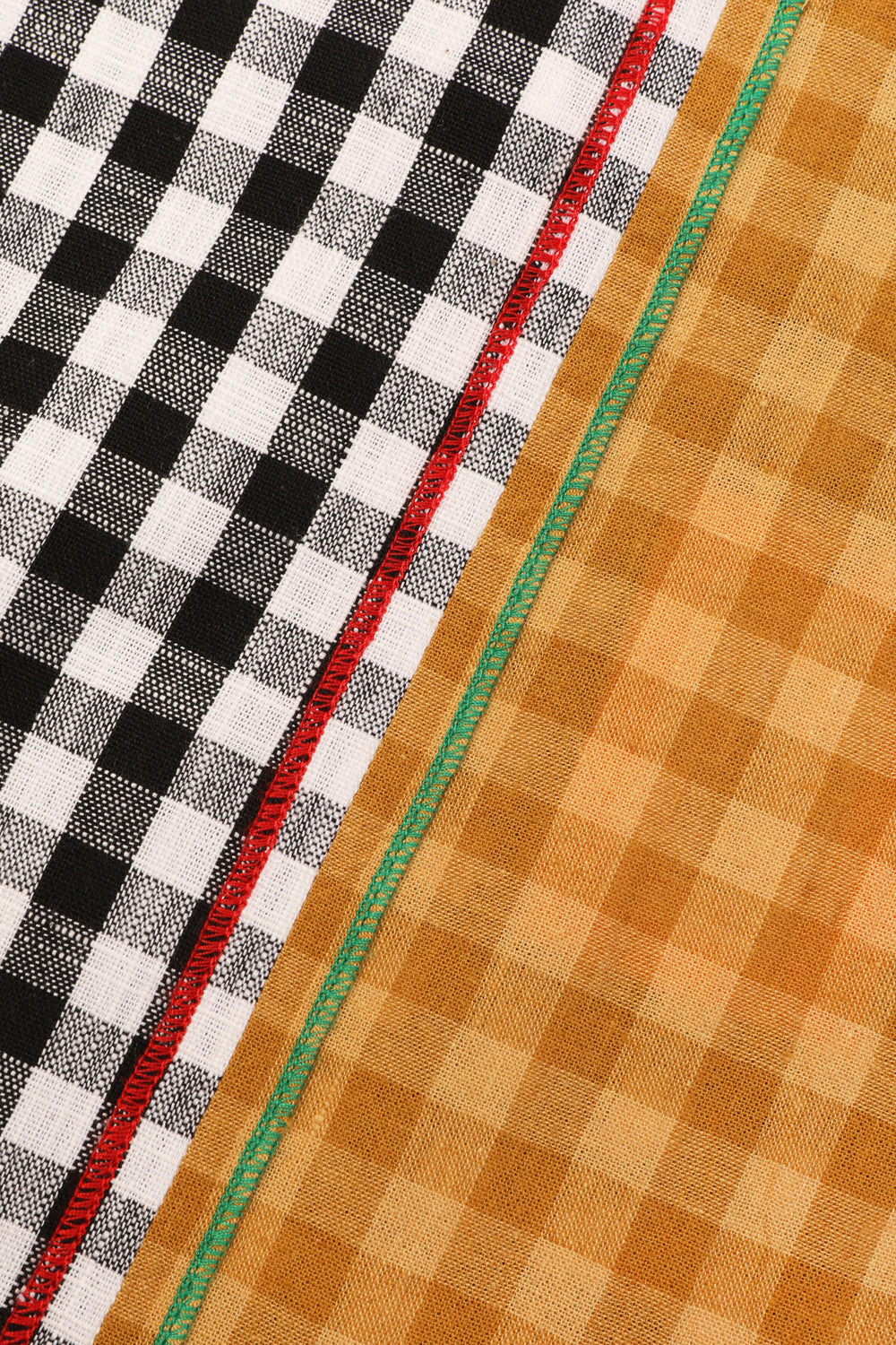 The Slade Dres is a midi length, longsleeved dress with a round neckline fastened with a contrasting zip at the back. It features an adjustable waistline fastened with a drawstring rope tie, side seam pockets and side splits. Crafted from a playful patchwork of various textural check and gingham fabrics, with contrasting primary coloured babylock stitching on the front seams and waistband.