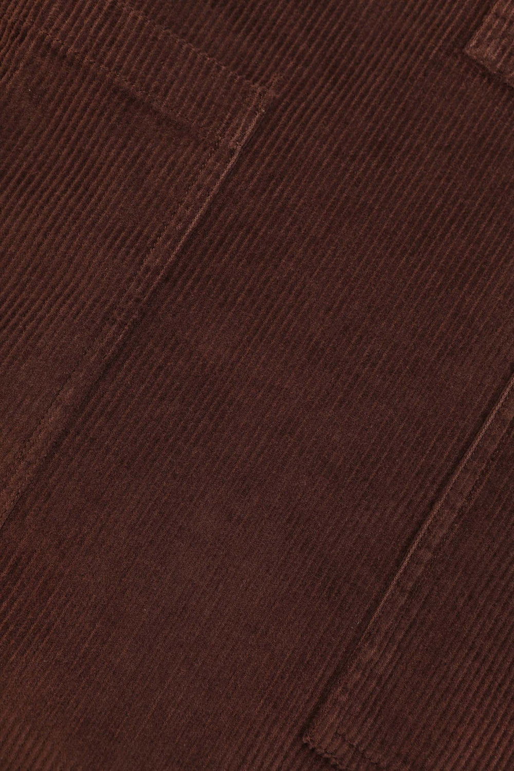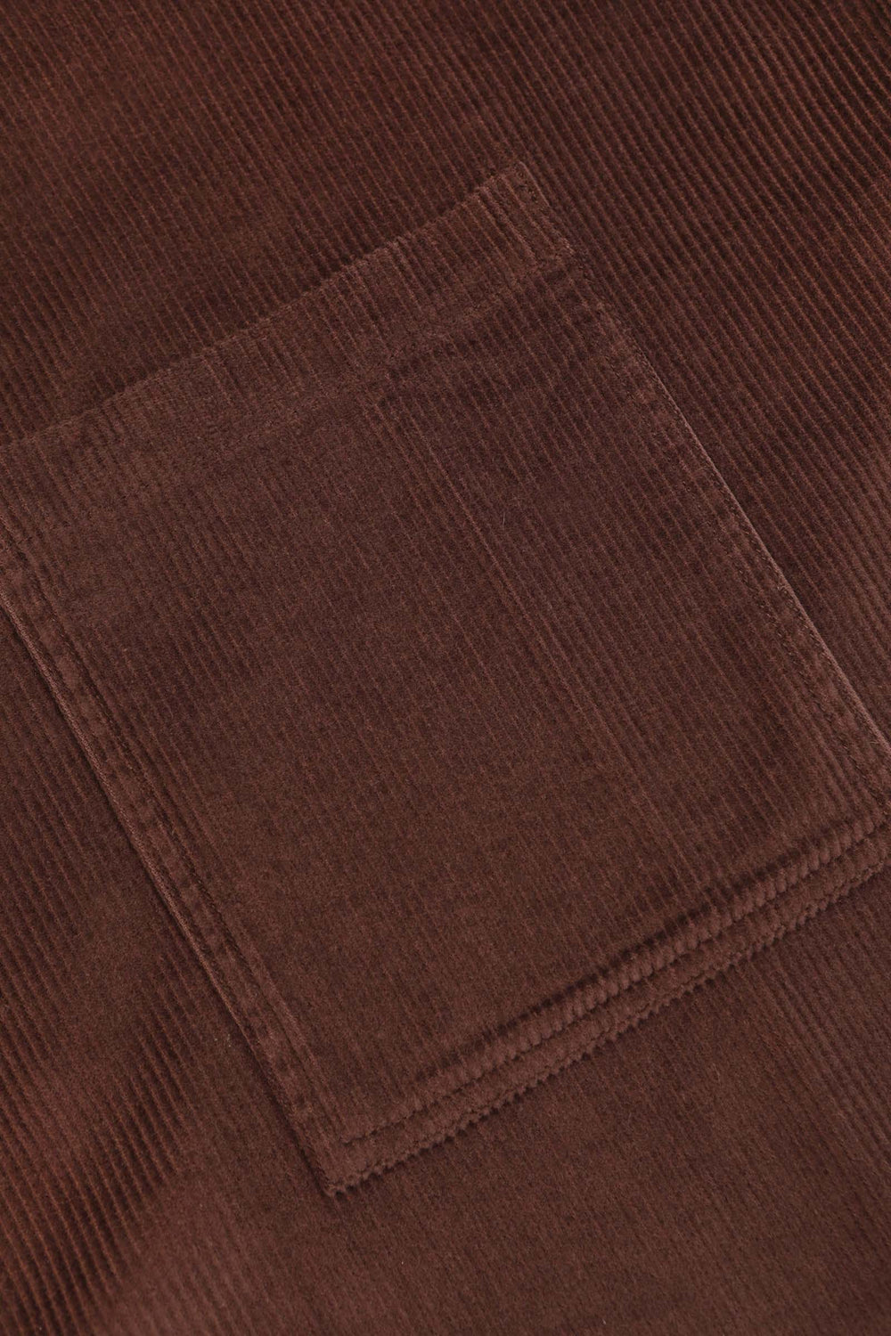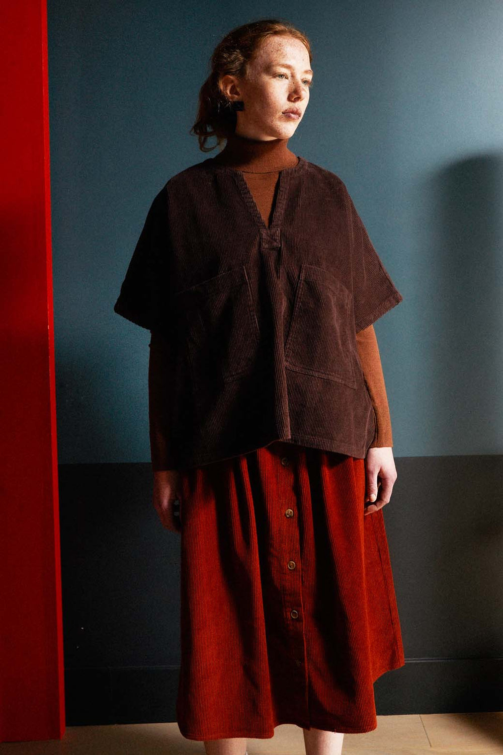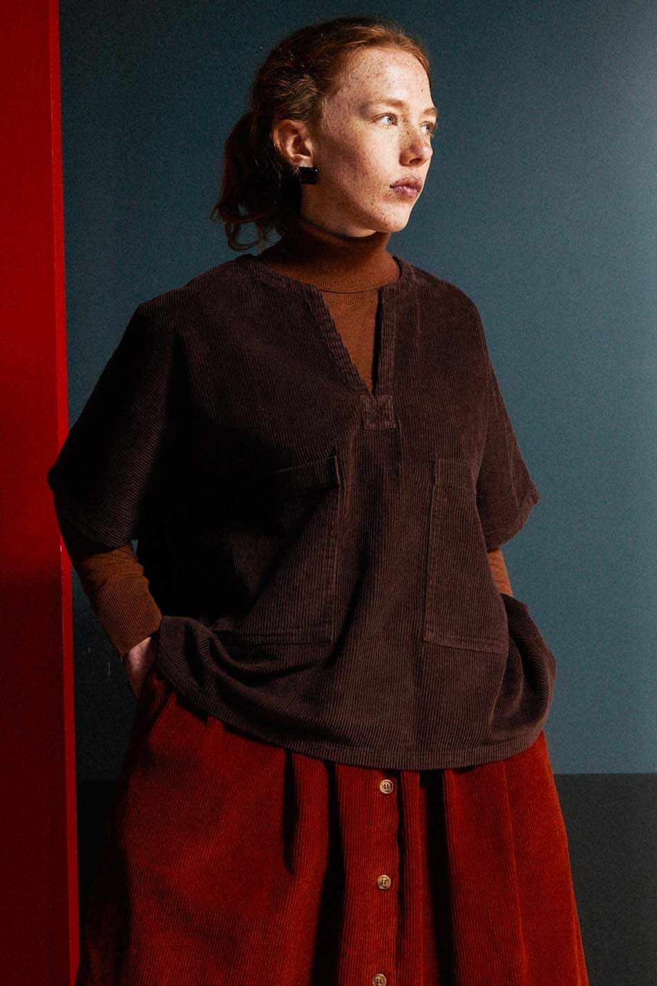 The Trevor Top is a wide-fit, boxy square shape top with a slight crop and short sleeves. Featuring a low v-neckline and front patch pockets. Made from a deep umber brown cotton corduroy.