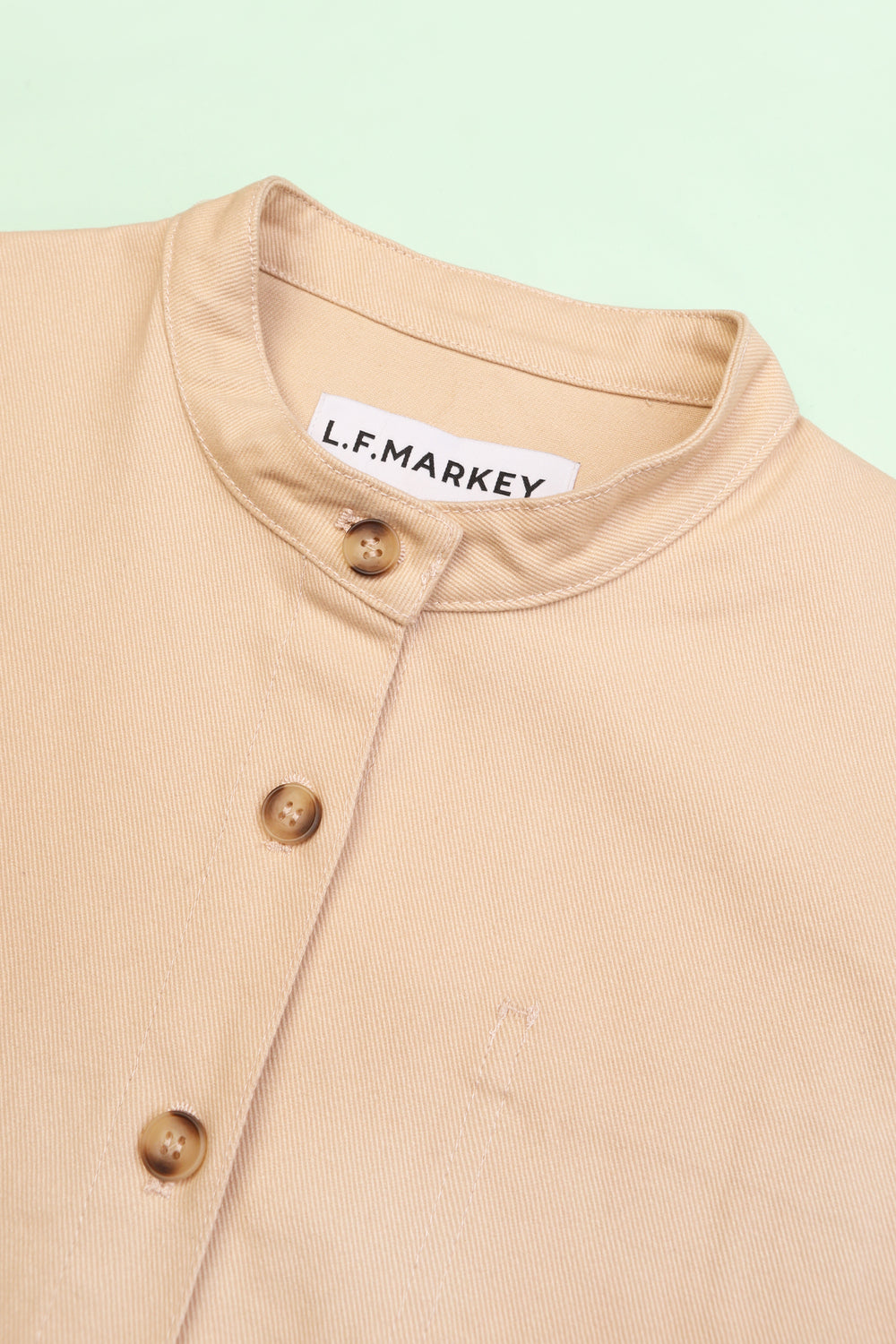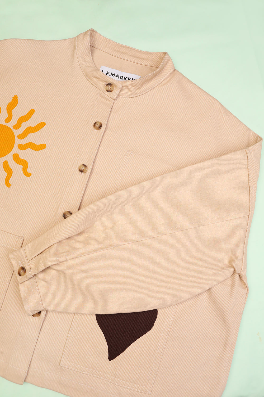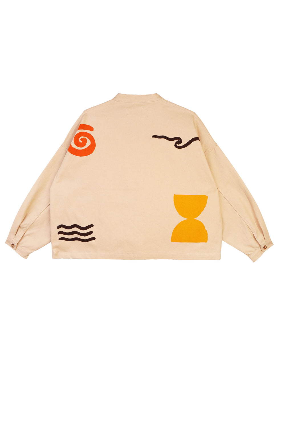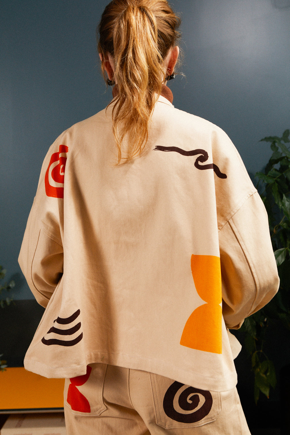 Our take on a classic chore coat with a wide boxy shape, voluminous sleeves and imitation horn buttons down the front. With side seam pockets and front patch pockets. Crafted from an ecru cotton drill with colourful painterly motifs throughout.