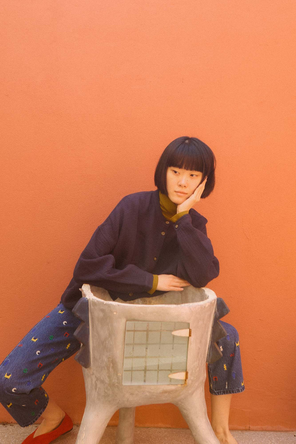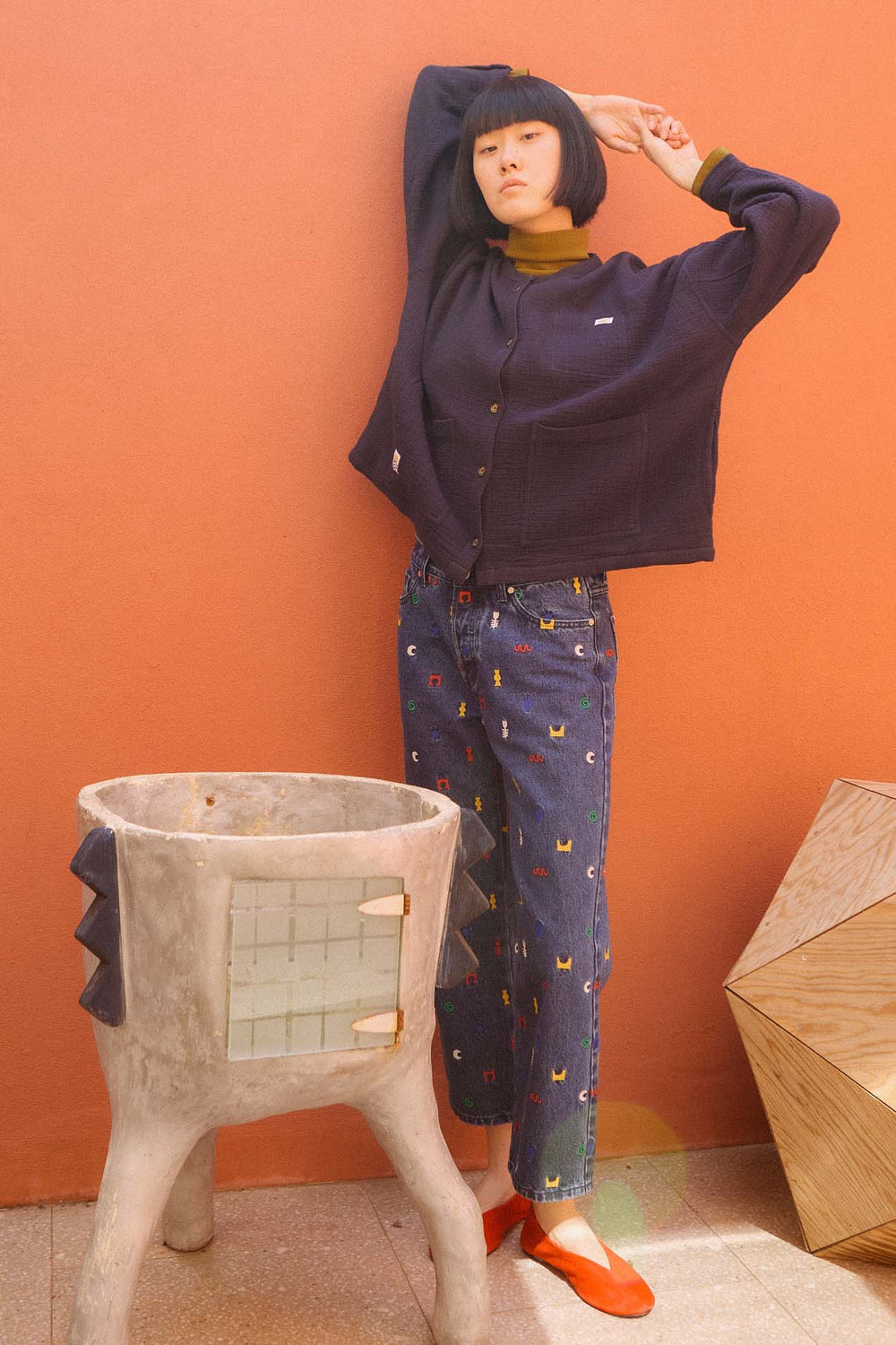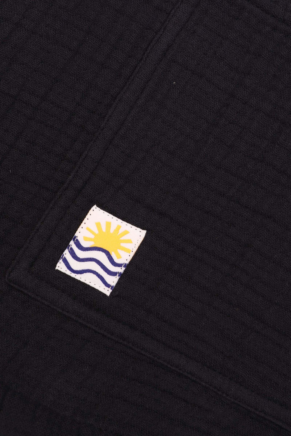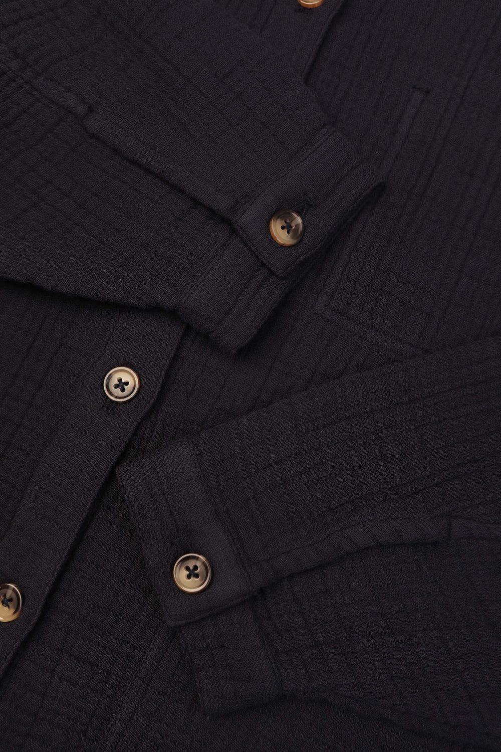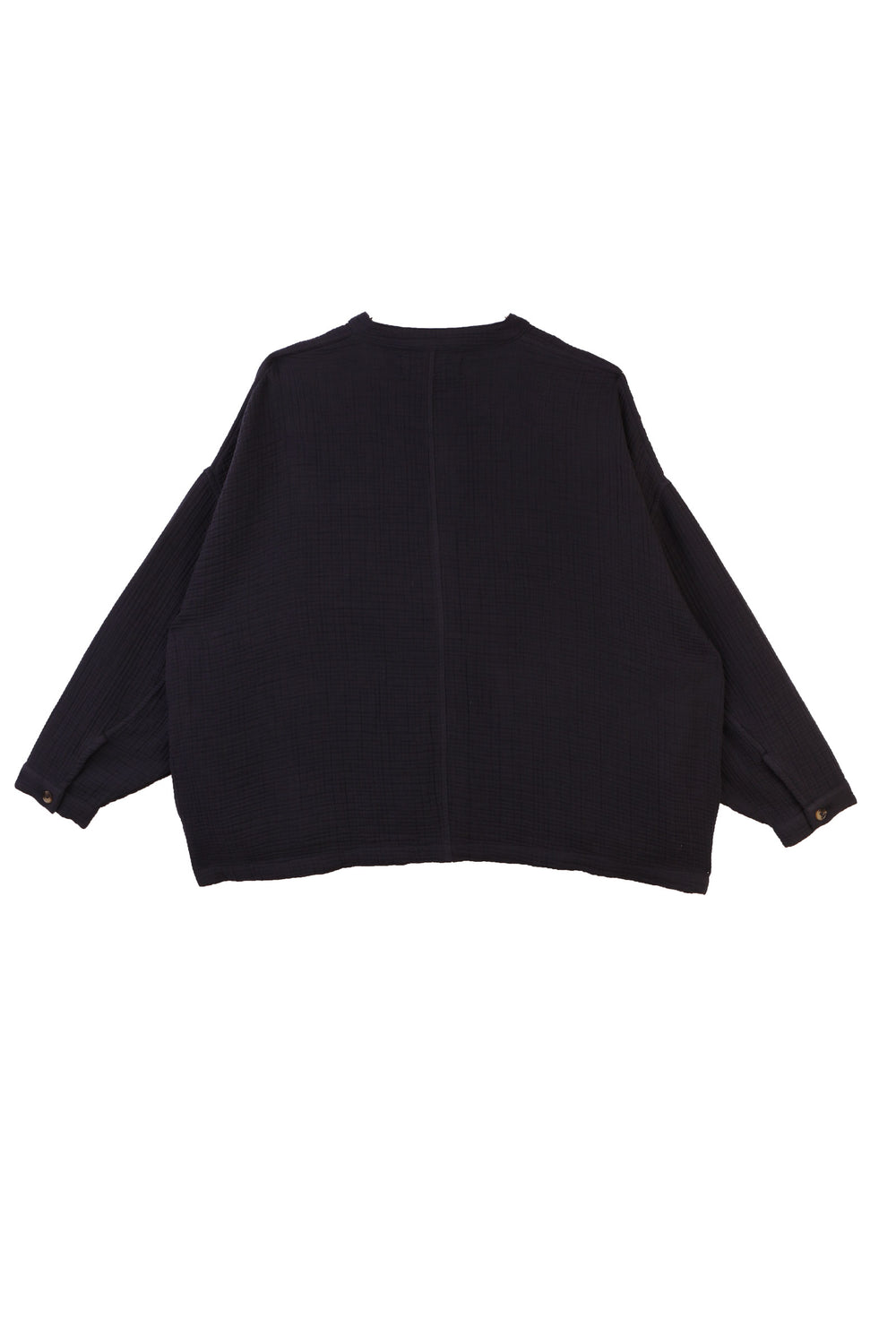 Our take on a classic chore coat with a wide boxy shape, voluminous sleeves and imitation horn buttons down the front. With side seam pockets and front patch pockets. Made in a textured 4-layer crinkle organic cotton gauze which adds tactility and dimension, with our signature sun and wave woven patch logos dotted throughout.