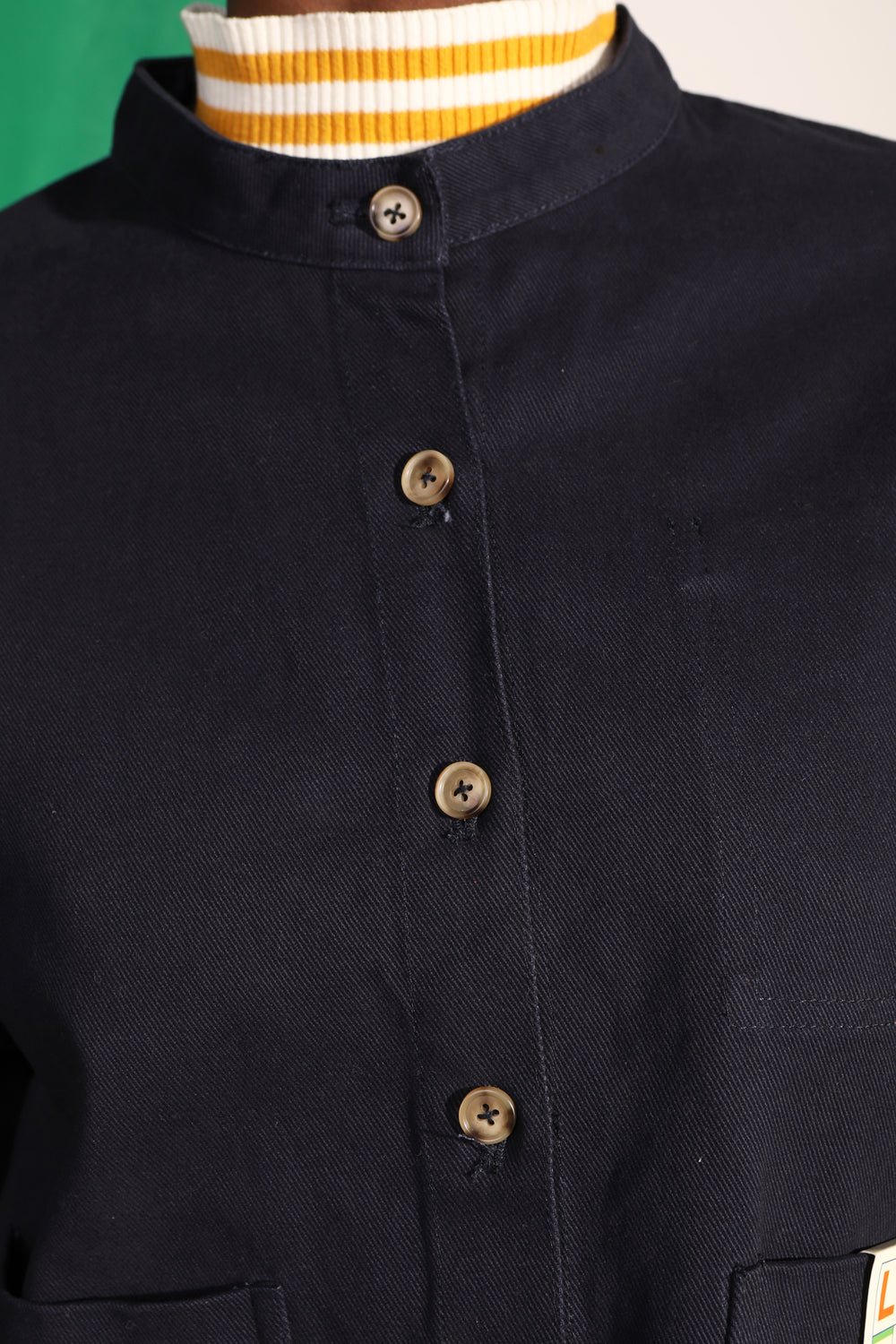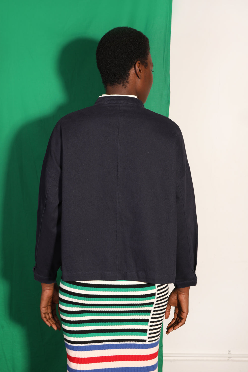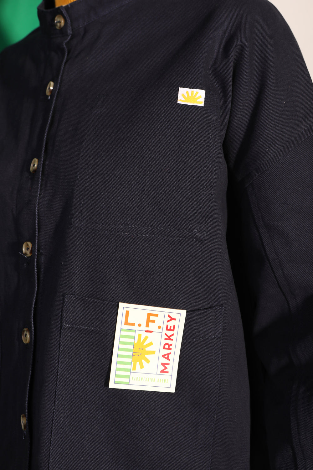 Our take on a classic chore coat with a wide boxy shape, voluminous sleeves and imitation horn buttons down the front. With side seam pockets, front patch pockets and a large removable cardboard label on the left pocket. In classic navy cotton drill with our signature sun and wave woven patch logos dotted throughout.