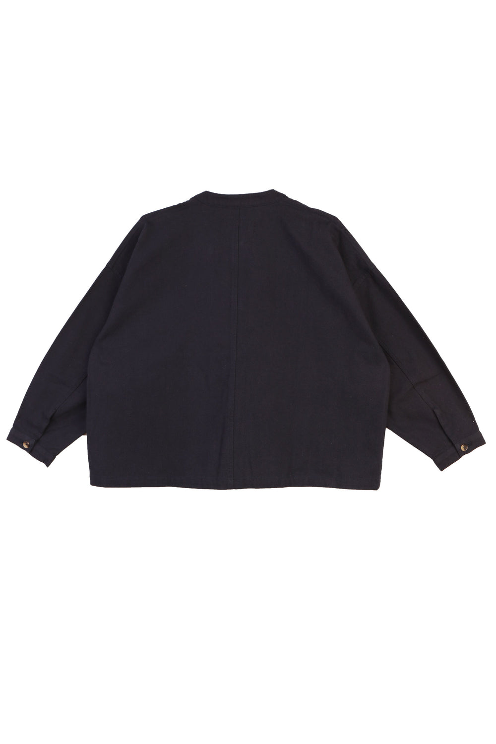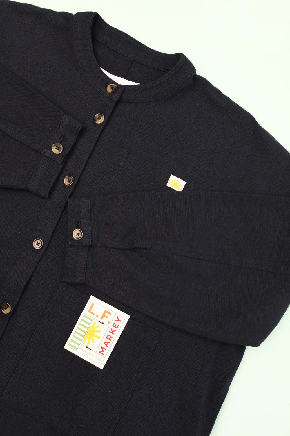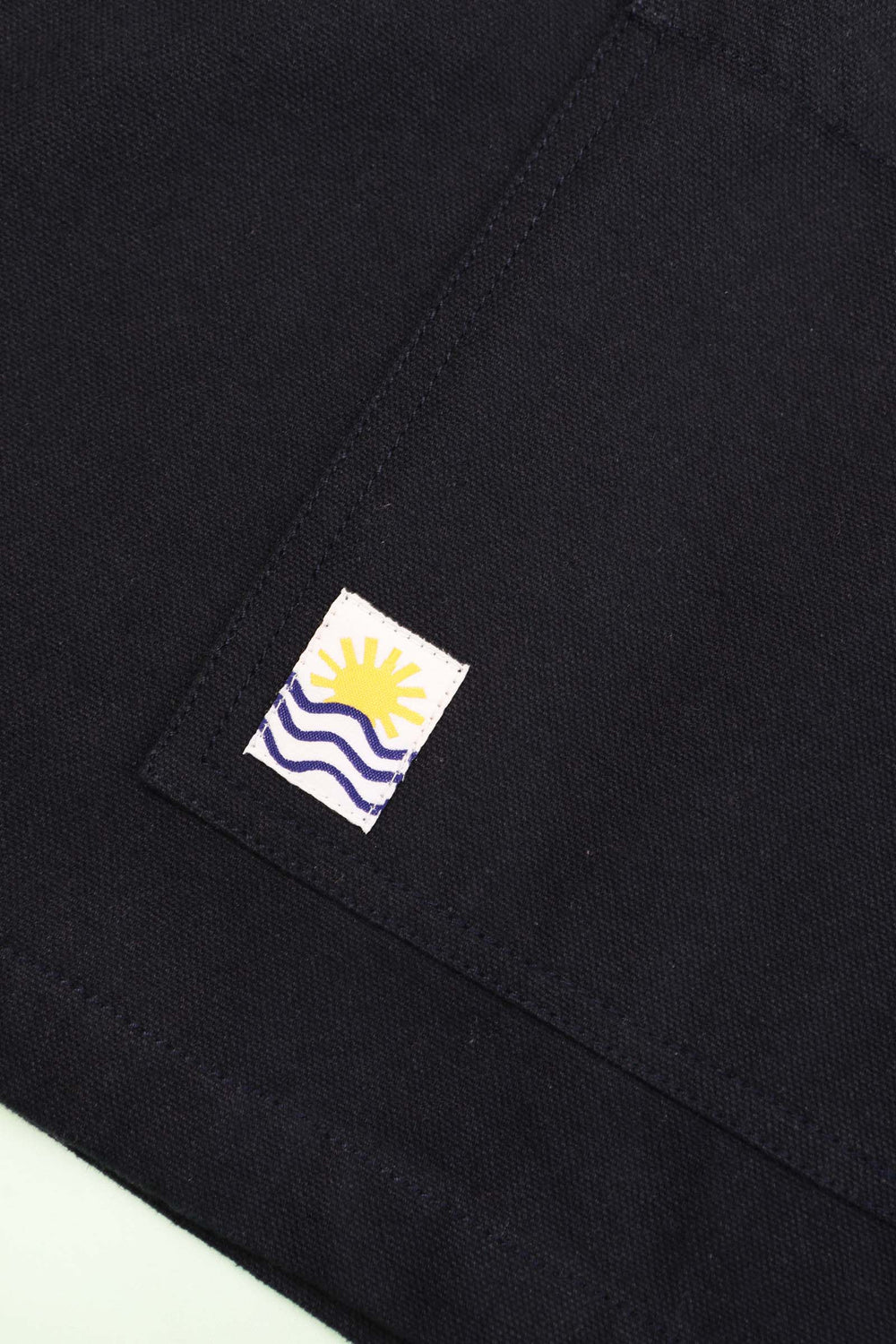 Our take on a classic chore coat with a wide boxy shape, voluminous sleeves and imitation horn buttons down the front. With side seam pockets, front patch pockets and a large removable cardboard label on the left pocket. In classic navy cotton canvas with our signature sun and wave woven patch logos dotted throughout.